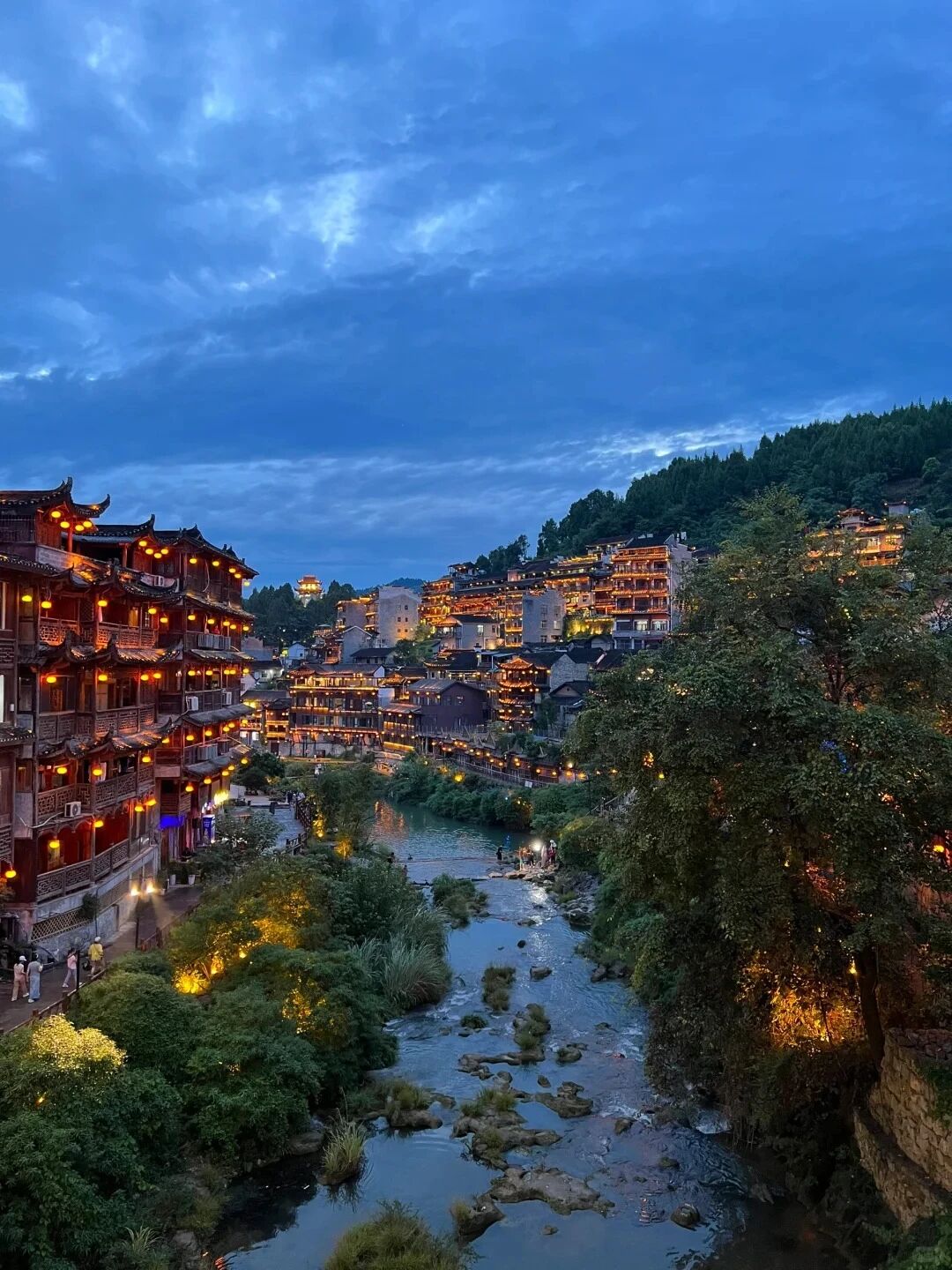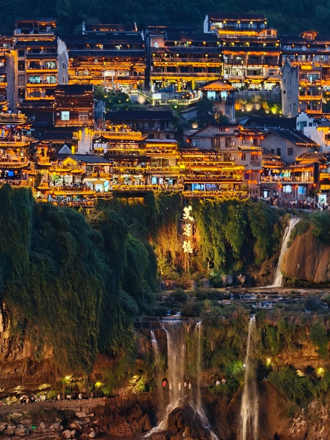 晚上更美。灯光亮起,瀑布化作金瀑,水雾在光影里飘散,整个古镇仿佛悬浮在水上。站在高处俯瞰,吊脚楼的万家灯火倒映在水面,瀑布在夜色里轰鸣,恍惚间不知身在何处,只觉如梦似幻。
