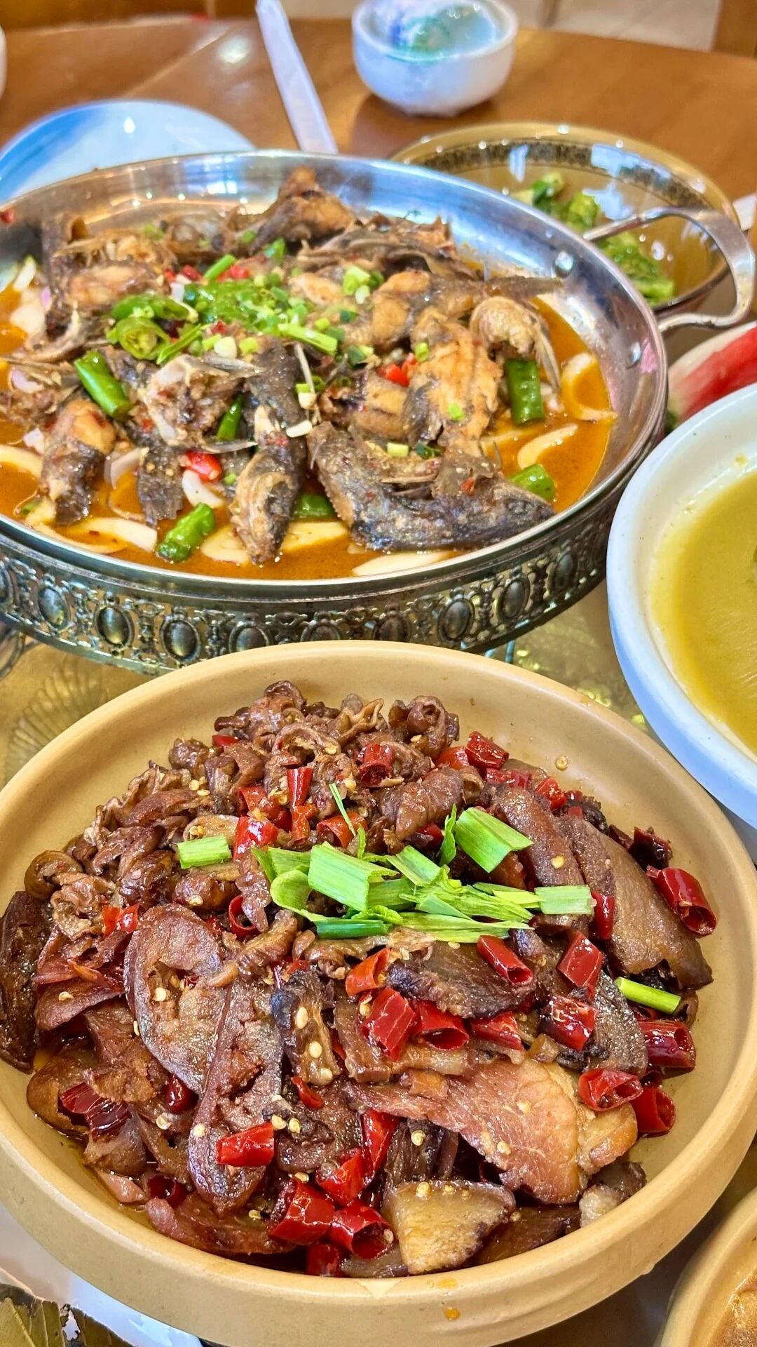 腊肉也值得尝尝。湘西的腊肉熏得黑黑的,切薄片炒着吃,肥的不腻,瘦的不柴,配着山里的空气吃,莫名觉得香。血粑鸭、社饭也是当地特色,味道偏重,但很下饭,每一口都是地道的湘西味。