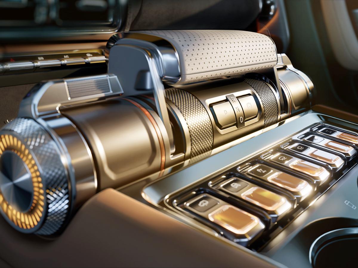 电子式的档杆造型很别致,使用了镀铬和皮质装饰,档杆后侧带有一组实体按键。
