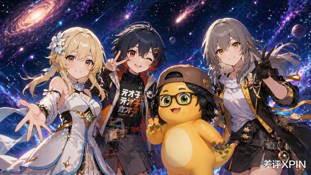 生成这个角色和原神里的旅行者(女)绝区零里的铃,崩坏星穹铁道里的星 这三个角色的合影,背景是无垠的宇宙