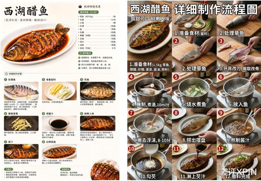 帮我制作西湖醋鱼这道菜的详细制作流程图,真实风格,适用于小红书图文比例(右边是 Gemini 做的。