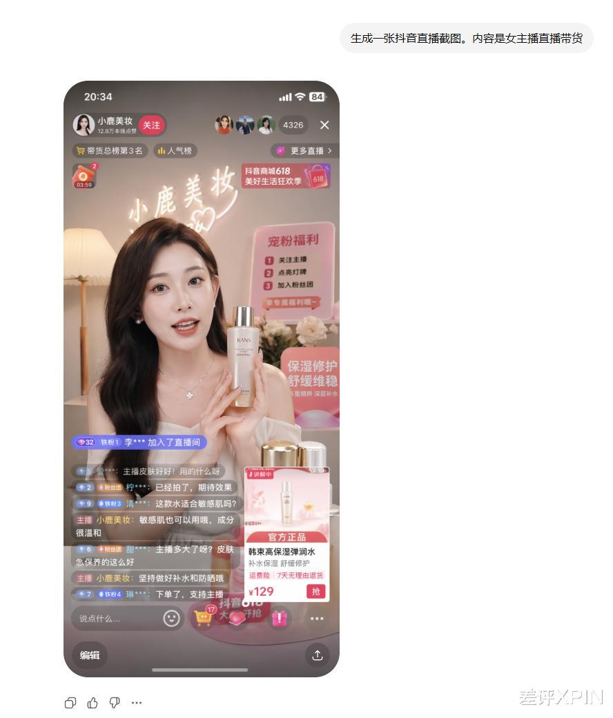 你还能发现,在生成抖音截图里,AI 观众还会在弹幕里实时交流,给咱们开演一波小剧场。