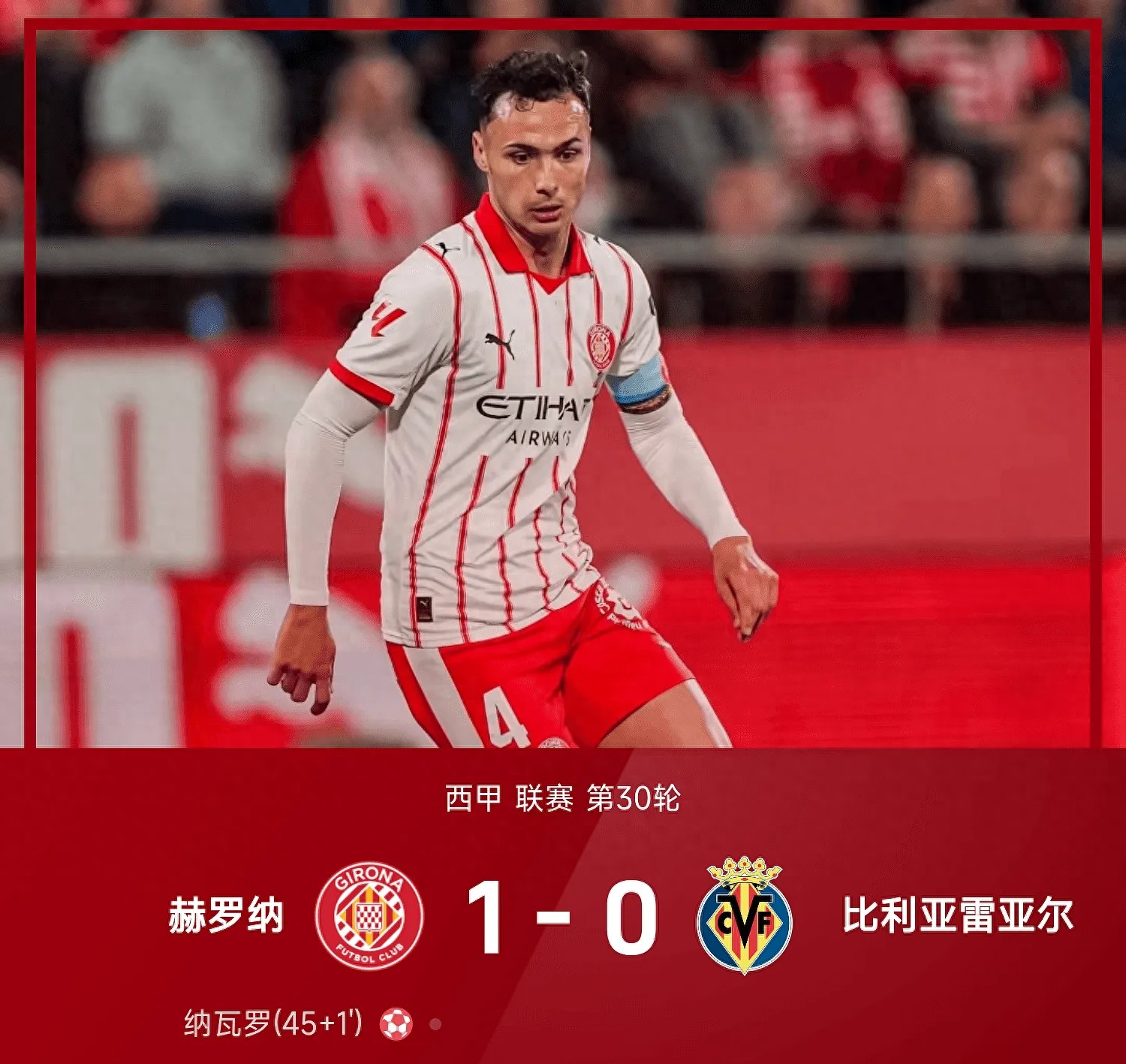 4月7日25/26赛季西甲联赛第30轮,赫罗纳1-0战胜比利亚雷亚尔。上半场补时阶段,纳瓦罗防守时不慎自摆乌龙,赫罗纳半场结束前取得领先。易边再战,两队均未能再改写比分,最终赫罗纳主场1-0小胜比利亚雷亚尔。