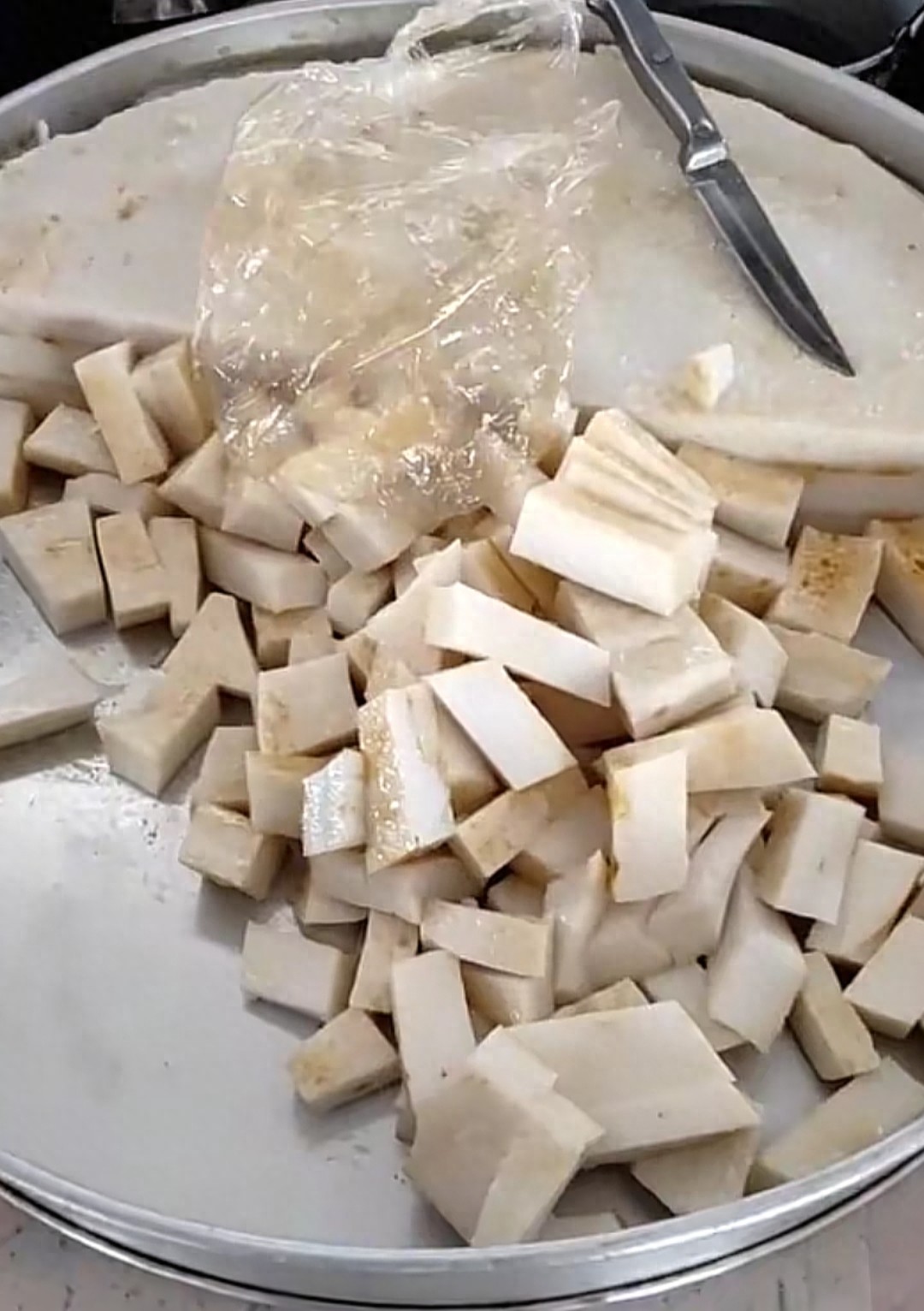 还有市场角的笼扣饭虾饼摊,它的妙处,在一个“脆”字、一个“香”字。特有雷州特色的蛤蒌糯米饭粒粒分明,被炸得金黄脆脆的面粉皮包裹着,那种焦香酥脆,撒上一些鸡盐粉,一口下去,先是脆,再是香,最后是回味无穷。那种脆,不是油炸食品的脆,而是火候与手艺共同铸就的、独属于客路街头的脆。