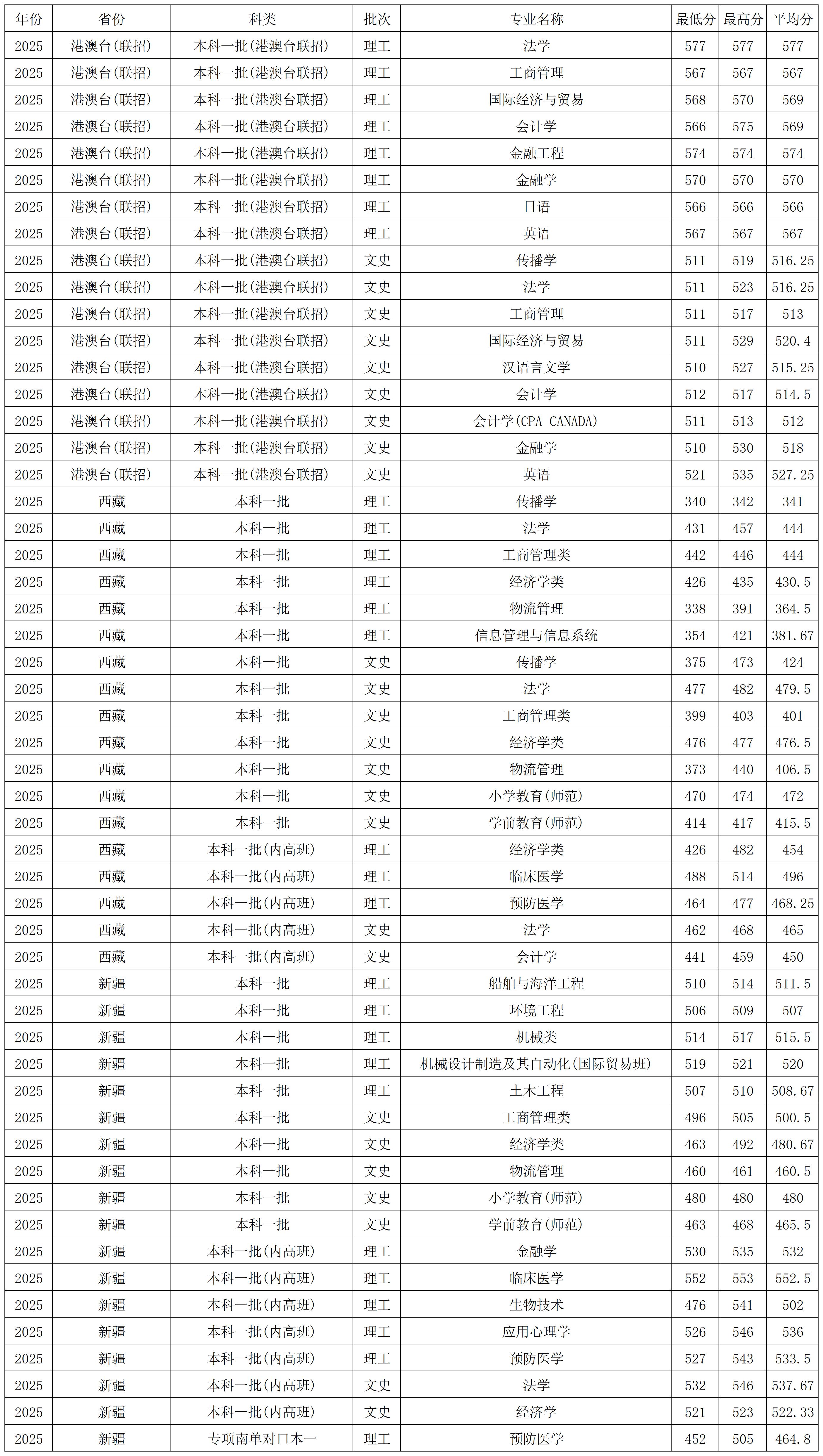 宁波大学2025年在港澳台联招、西藏、新疆各专业录取分数线