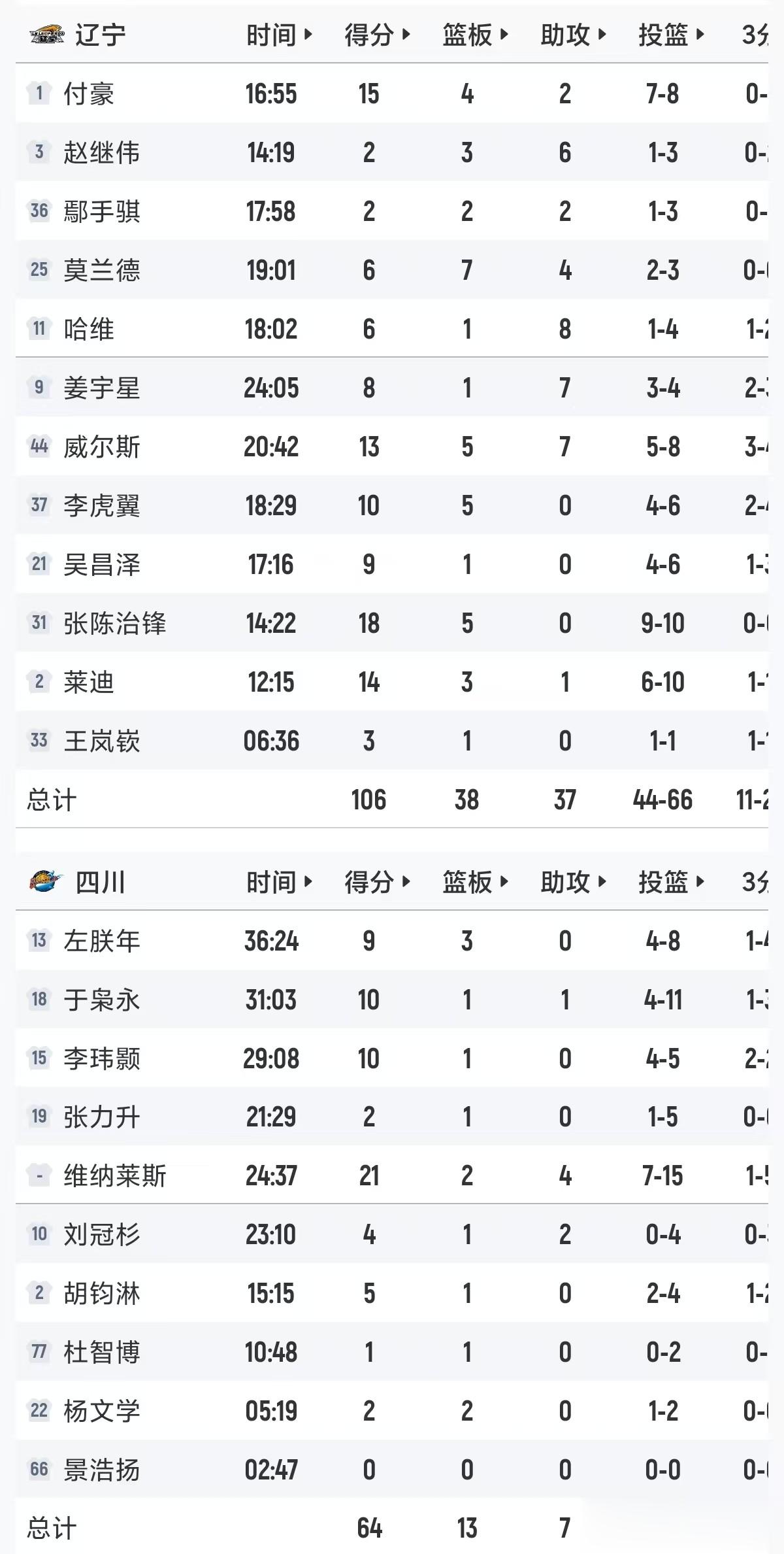 下半场比赛,辽宁开局将分差扩大到20分,随后换上轮转阵容,张陈治锋本节过半终于登场,这套阵容反而帮辽篮继续扩大领先,三节战罢辽宁领先24分。末节比赛,张陈治锋彻底爆发,最终辽宁106-64狂胜四川。