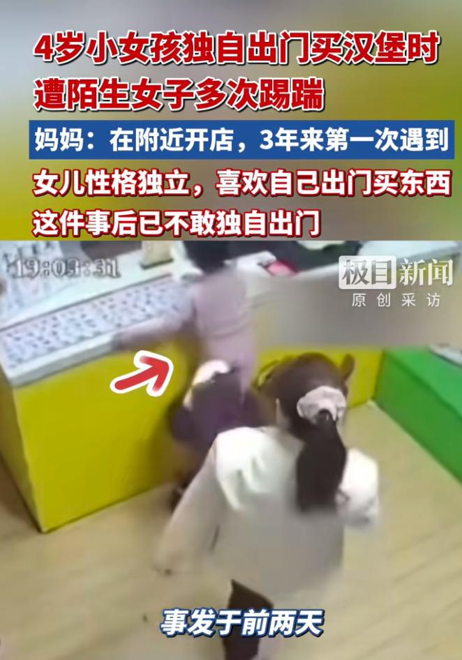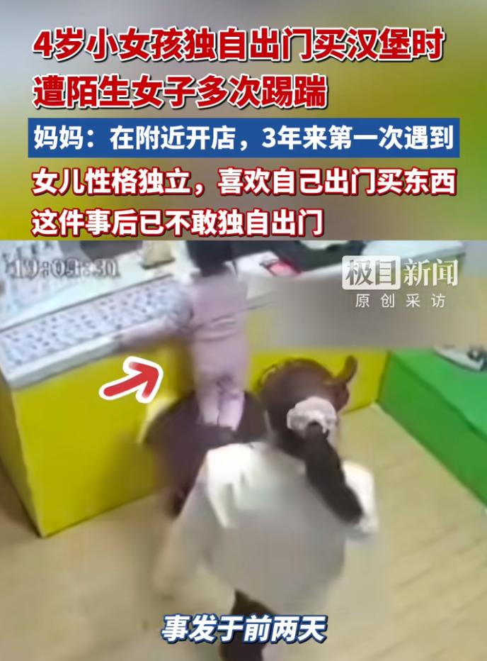 河南四岁女孩独自来到汉堡店买汉堡,好端端坐在椅子上却遭到女子多次踢踹,最后女孩哭着跑回了家。