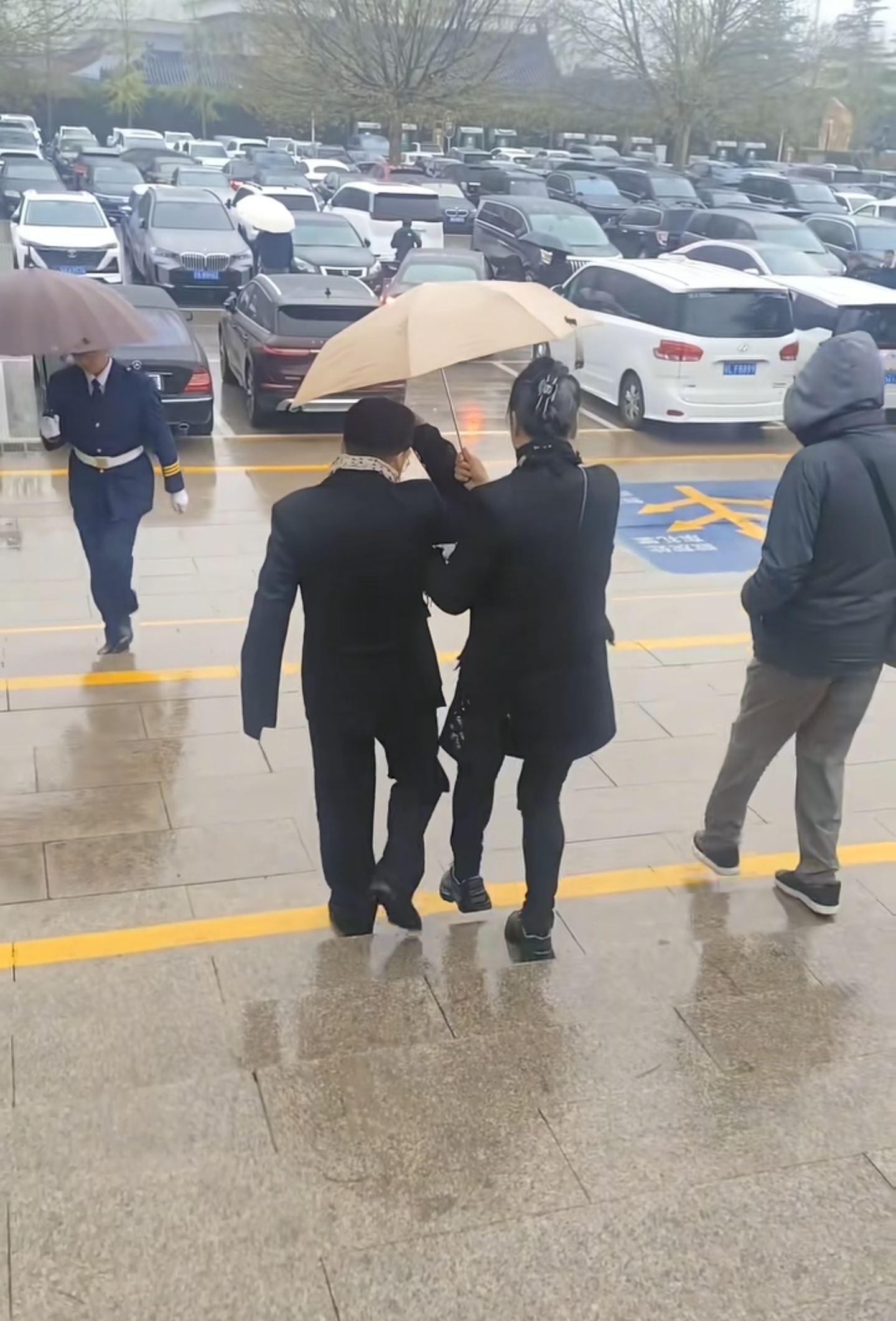 六小龄童老师穿着一身黑色的长款大衣,围着一条米白色的围巾,在雨中,身边的人给他撑着伞,他微微低着头,脚步沉重地往前走。
