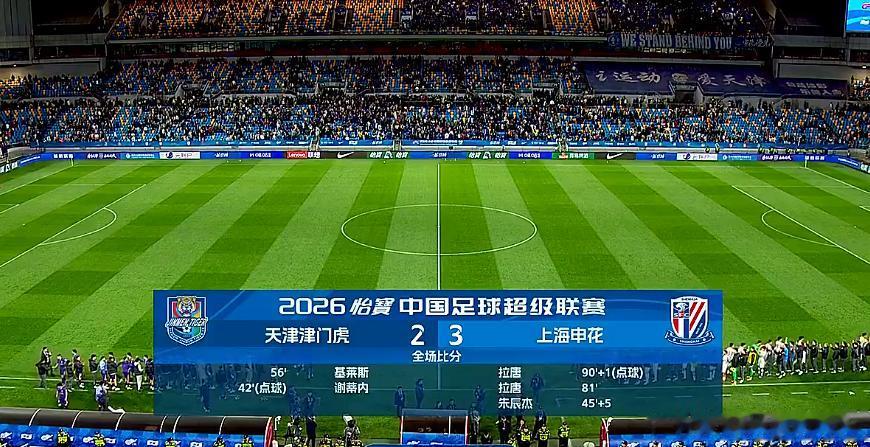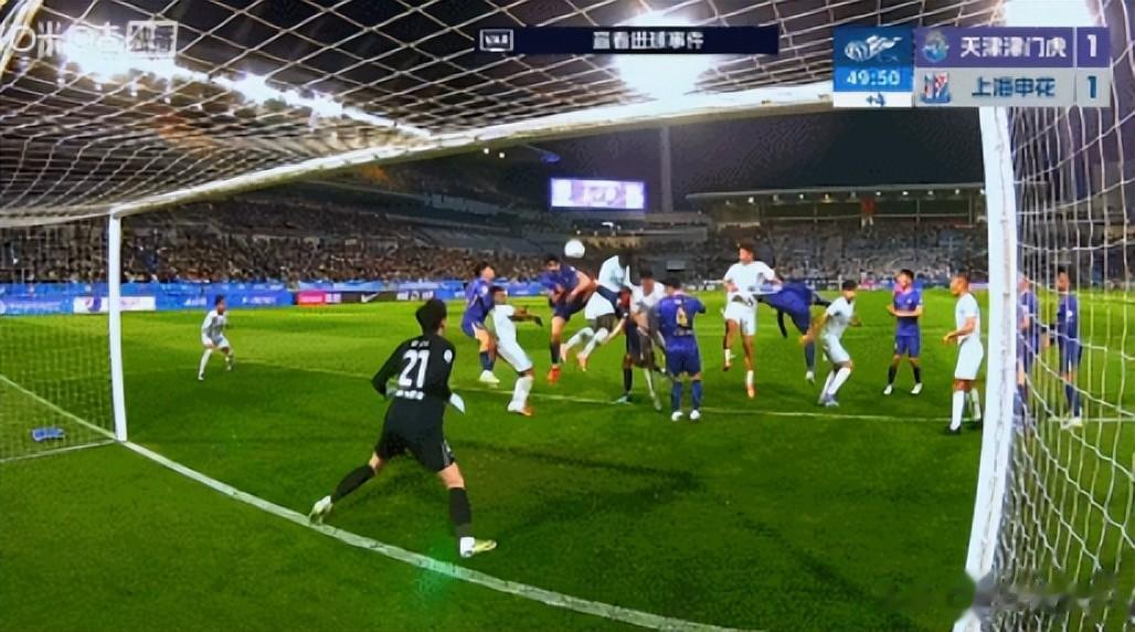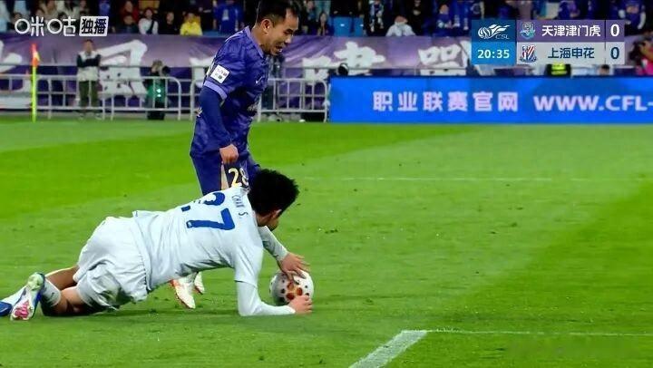 本轮最后一场比赛是榜尾大战申花(-5)vs天津津门虎(-9),津门虎凭借点球打进了赛季的第一个进球,但是半场补时被申花追平,有意思的是申花上半场陈晋一的“用手扒拉球”居然裁判和var都视而不见,也是引得全场的球迷十分不满。
