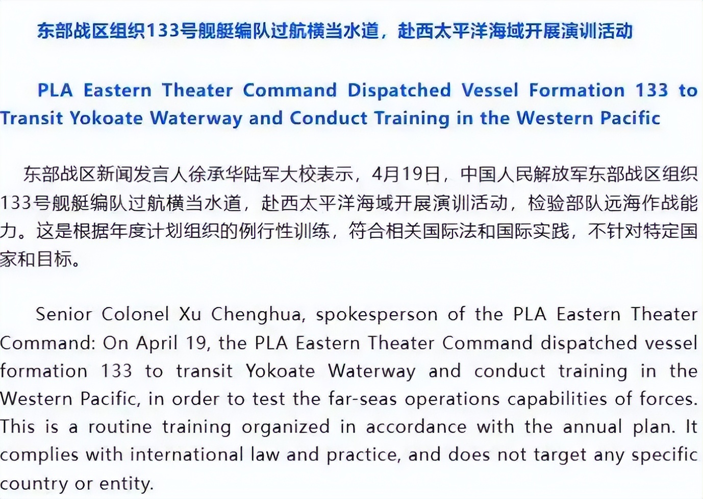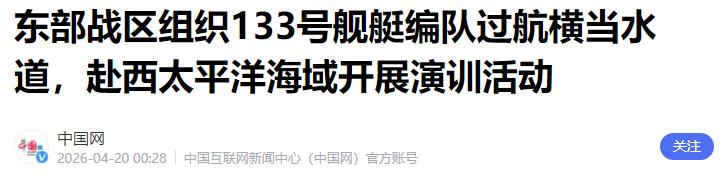 4 月 19 日,东部战区进一步加码行动,组织 133 号舰艇编队过航横当水道,前往西太平洋海域开展演训活动,重点检验部队远海作战能力和协同作战水平。