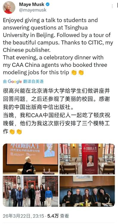 3月22日梅耶·马斯克晒出美照并配文:“很高兴能在北京清华大学给学生们做讲座并回答问题,之后还参观了美丽的校园。感谢我的中国出版商中信出版社。当晚,我和CAA中国经纪人一起吃了顿庆祝晚餐,他们为我这次旅行安排了三个模特工作。”