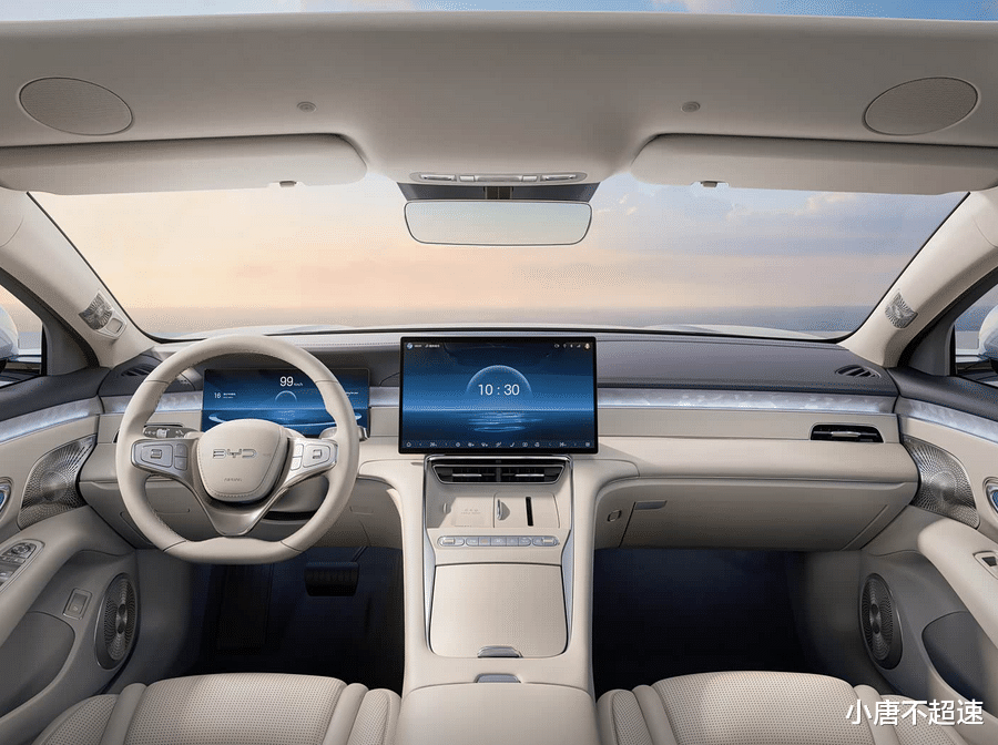 从官图来看,海豹08的内饰延续了海洋美学2.0的设计语言,官方将其理念概括为“松弛之境”与“治愈之美”。车内整体风格偏向简约,中控台采用分层式布局,一条宽幅的贯穿式饰条横跨左右,提升了视觉上的精致感。方向盘造型较为流畅,两侧保留了实体按键,便于驾驶过程中的操作。中控区域设置了悬浮式的方形中控屏,换挡机构为怀挡形式。此外,后排设有独立的空调控制屏,并提供了小桌板和宽大的中央扶手。