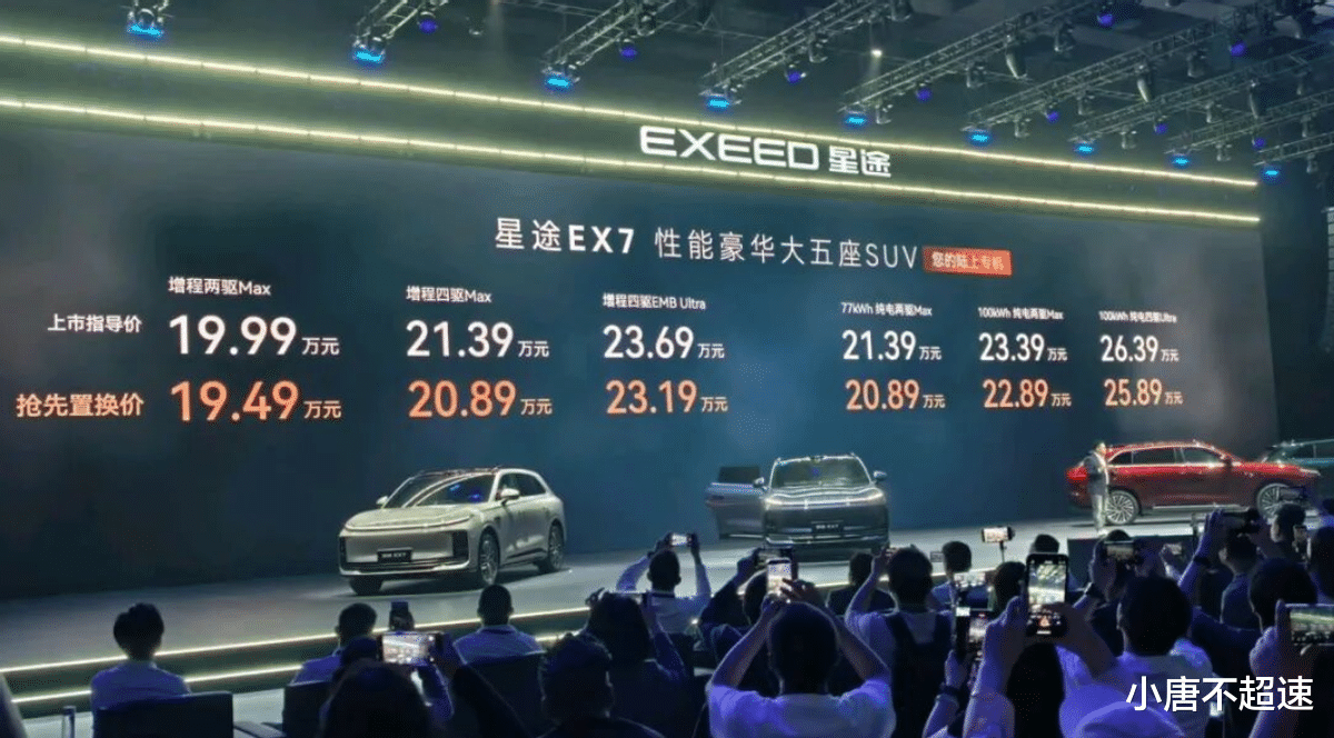 4月19日,星途汽车旗下中大型SUV——星途EX7正式上市。新车共计推出6款车型,分别是增程两驱Max、增程四驱Max、增程四驱EMB Ultra、77kWh纯电两驱Max、100kWh纯电两驱Max、100kWh纯电四驱Ultra。车身长宽高分别为4988毫米、1975毫米、1710毫米,轴距为3000毫米,定位为中大型五座SUV。