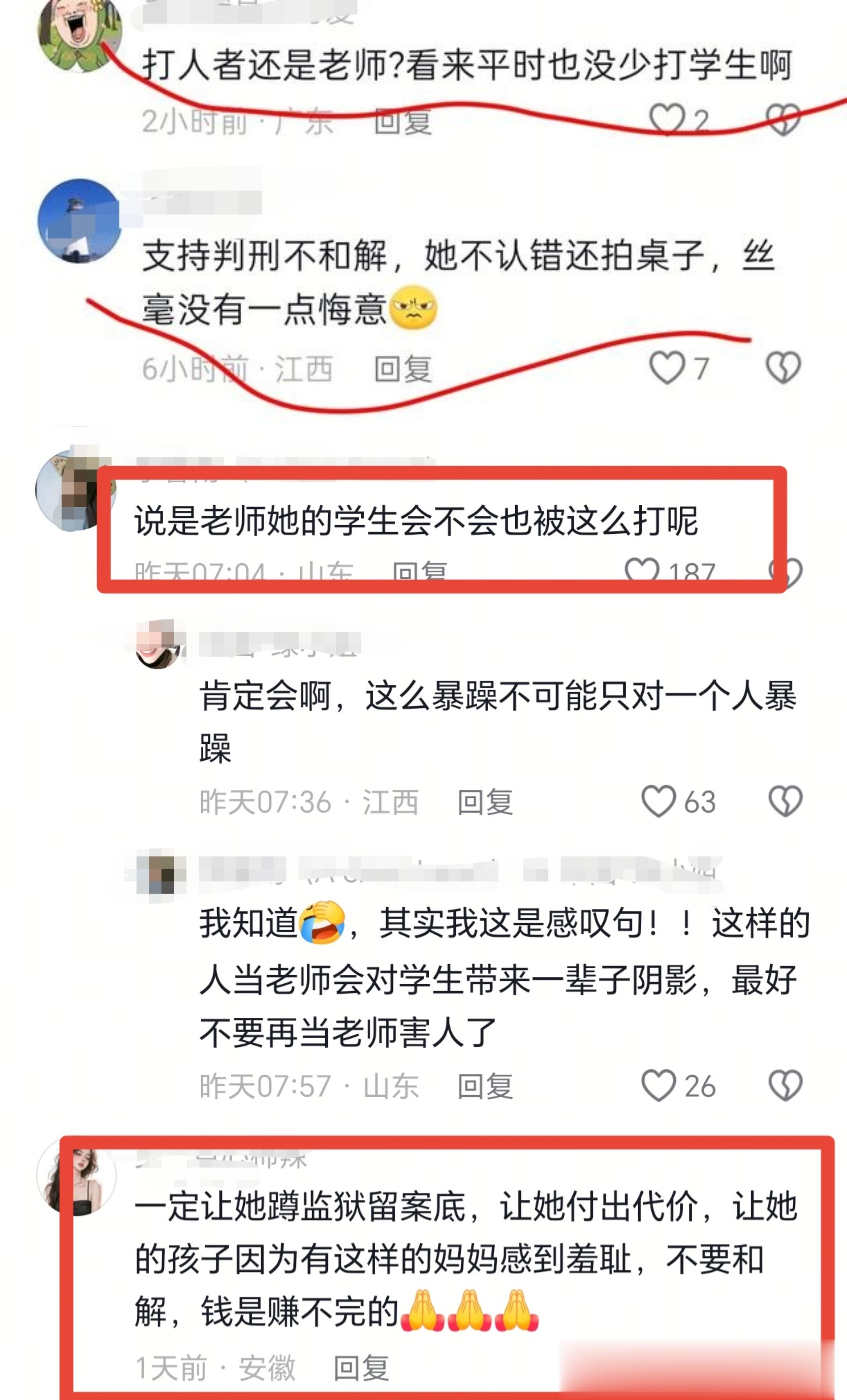 对此,网友就更加认定,动手女子的过错不能就这么算了,起码也得要吊销jiao师资格证才能对孩子负责,起到震慑的作用。
