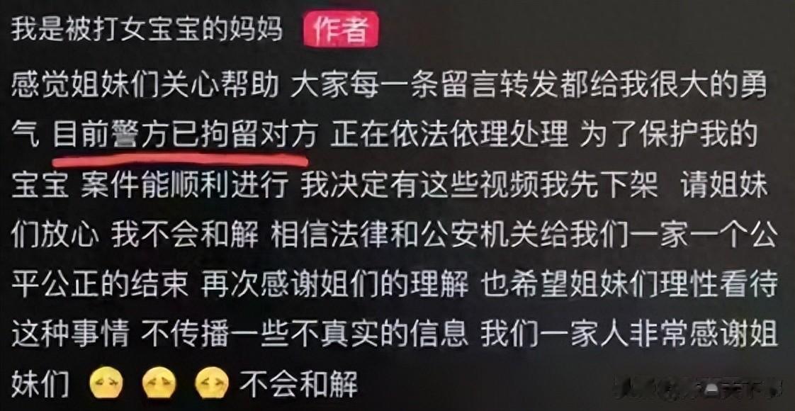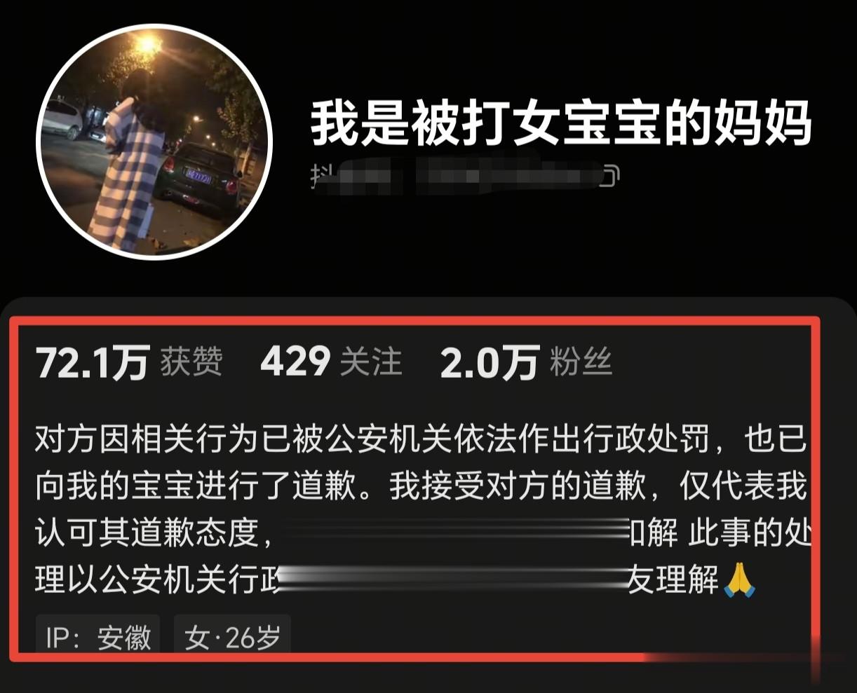 她的原话是这样说的:对方已经就相关行为被帽子叔叔行政处罚过了,具体怎么处罚没有明确说明,但对方后来愿意向她的宝宝道歉,是她一直想要的结果。