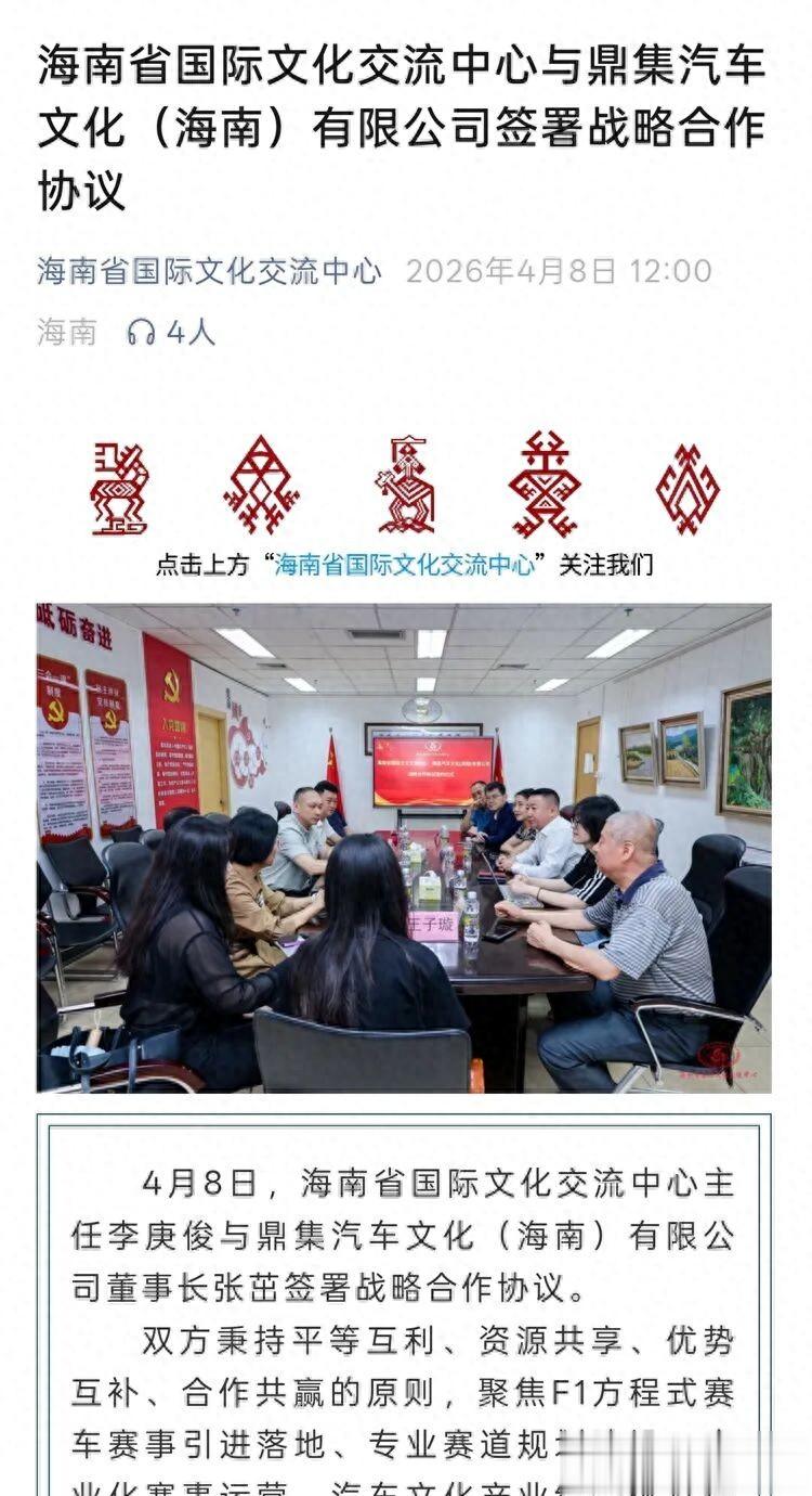 4月8日,海南省国际文化交流中心与鼎集汽车文化(海南)公司签署战略合作协议。双方将聚焦F1方程式赛车赛事引进落地、专业赛道规划建设、商业化赛事运营、汽车文化产业综合体打造及文体旅深度融合发展等核心领域,开展全方位合作。下一步,双方将高标准推动海南F1方程式赛车项目落地见效。