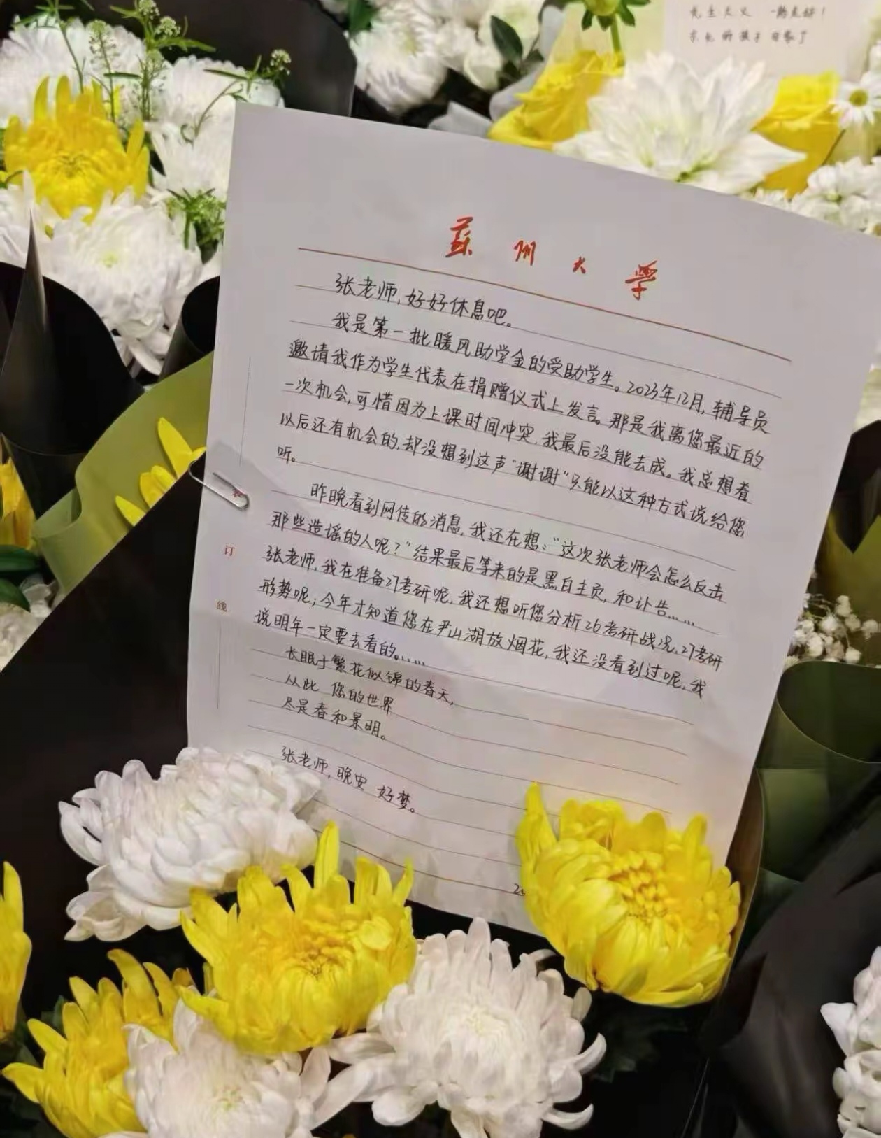 值得关注的是,在张雪峰公司外摆放的鲜花中有一封迟到的感谢信也公开了,句句催泪,也反映了张雪峰这些年在教育和公益方面影响力。
