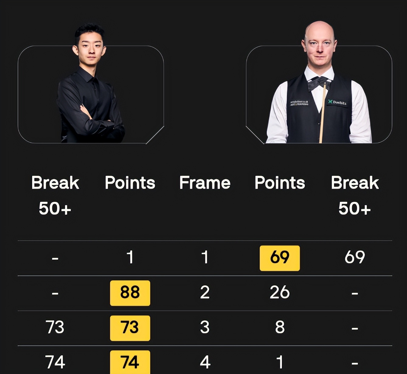 第三局成为整场比赛的转折点。双方开球后陷入多轮防守缠斗,韦克林率先尝试长台进攻底袋失手,仅拿到 8 分便中断进攻,随后的防守回合再次出现漏球。吴宜泽稳稳抓住上手机会,轰出单杆 73 分一杆制胜,连下两局实现比分反超。第四局吴宜泽手感彻底打开,开球后便获得上手机会,精准轰出单杆 74 分完成超分,韦克林仅拿到 1 分便直接认输。至此,吴宜泽完成 3 连鞭,以 3-1 的领先优势结束上半场对决,双方进入中场休息。