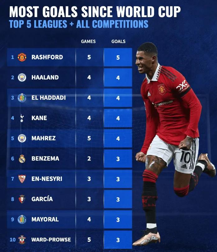 拉什福德在世界杯后为红魔打入5球,是五大联赛进球数最多的球员。 1、拉什福德(5场5球) 2、哈兰德(4场4球) 3、穆里尔(4场4球) 3、凯恩(4场4球) 5、马赫雷斯(5场4球) 6、本泽马(2场3球) 7、恩内斯里(3场3球) 7、基克-加西亚(3场3球) 9、马约拉尔(4场3球) 10、沃德-普劳斯(5场3球) 拉什福德以及曼联在世界杯之后都保持了很好的状态,但客观上来说确实曼联的对手成色也差点意思!但曼联在下一场联赛杯对阵查尔顿后即将面对曼城,也正好可以好好检验一下曼联现在整体的强度。