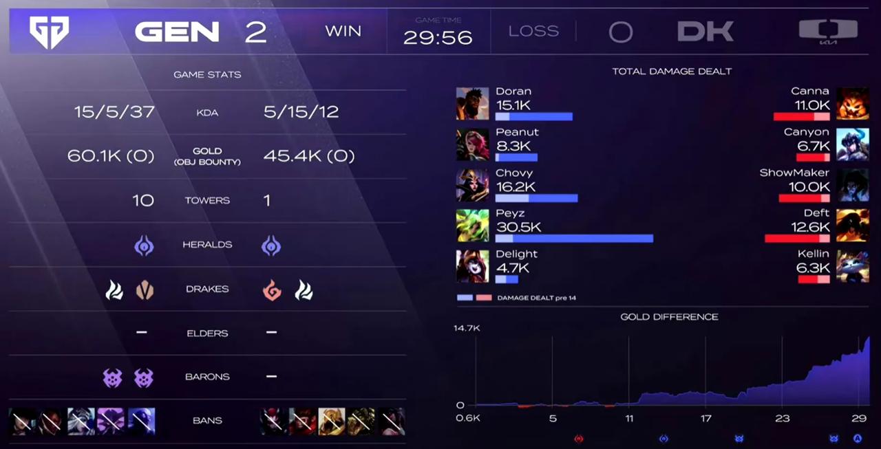 在另一片赛场上,GEN直落两盘击败了DK,送给了对手两连败! showmaker上一场面对T1被faker打得全程毫无声音,这场面对chovy表现更是没法看!!! 其实仔细想想许秀去年联赛就挺一般的,只是世界赛上面对GEN那个bo5打得不错,这回到联赛又是老样子了!许秀如果一直这样,估计今年的DK也很难说好于去年。