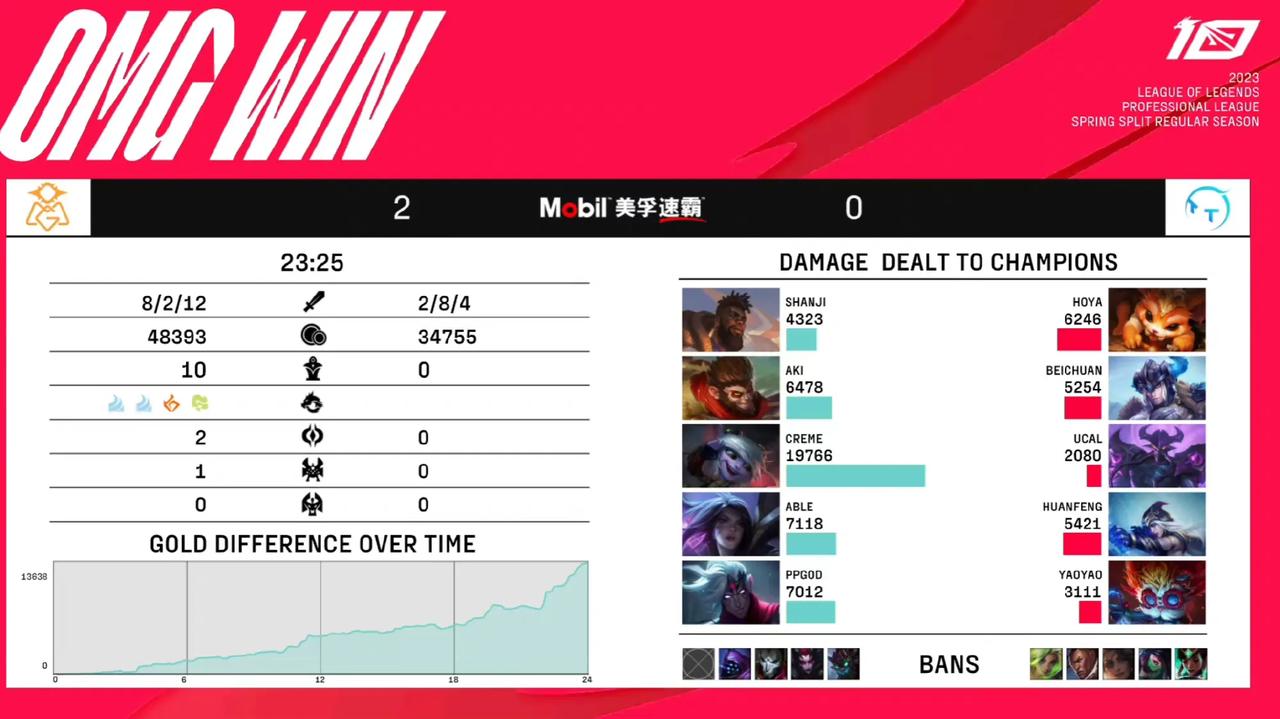 像TT这种队伍感觉离前面强的战队总是差那么一点意思! 上次能非常漂亮地击败WBG,今天也能非常顺利地输给OMG!第一场比赛在优势下被翻盘后第二场直接懵了!ucal这个卡萨丁2000的伤害是能说明问题的。 像TT这种季后赛边缘的队伍如果在与实力相差不大的对手直接交锋时没拿下是非常伤的,上赛季的TT就是离季后赛只差一步!不过好像这赛季LPL整体实力有减弱的趋势,所以还是有机会的。