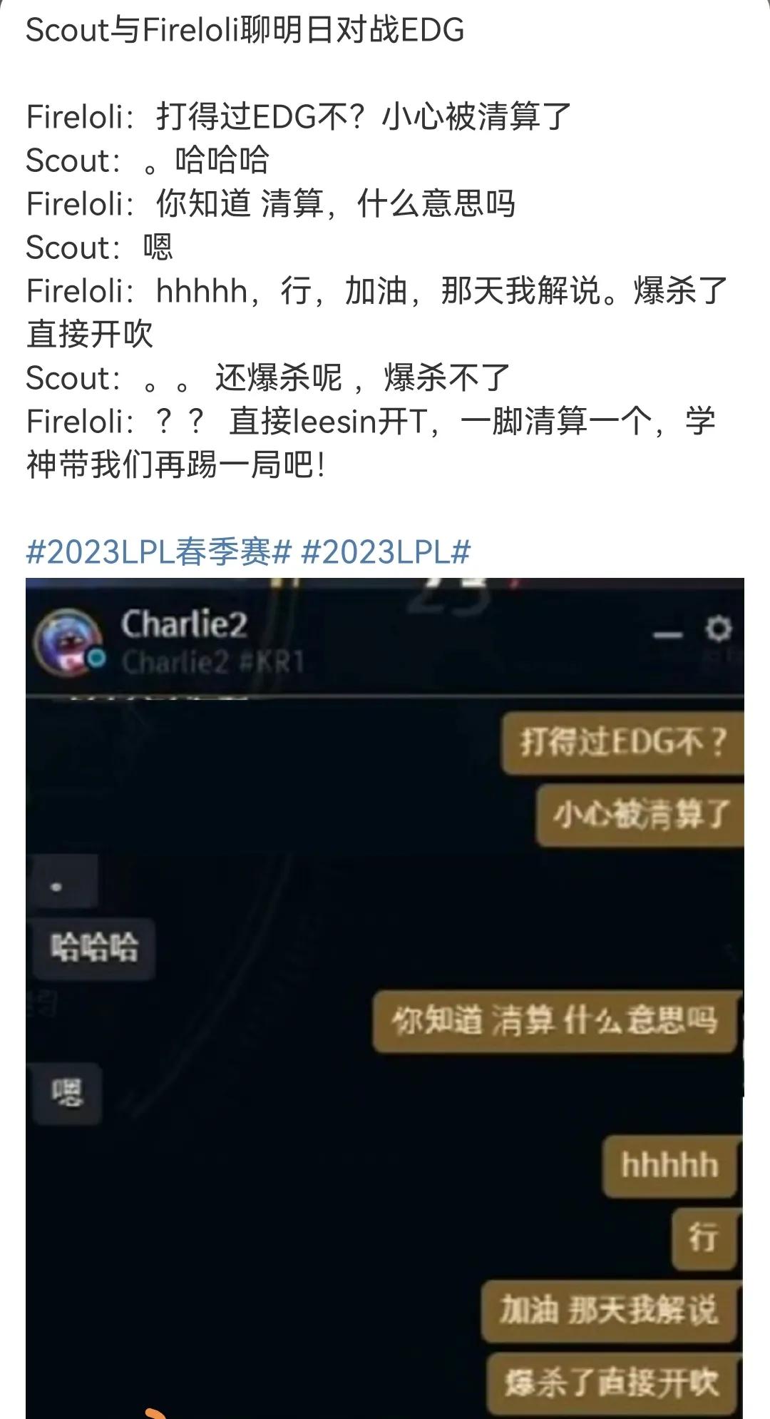 EDG对于scout今年转会期一系列的操作不满是一定的!就这张创意十足的海报就能看出来的,而且在scout离开EDG加盟LNG时EDG官方也没发布任何相关消息! 不过这fireloli你是真的作死!也搞不明白他为什么会来这么一通操作?即便你是开玩笑的,这个时机你真的是没找对的,反正就觉得这人这事情商太低了!!! 不过今天的比赛应该挺精彩的。