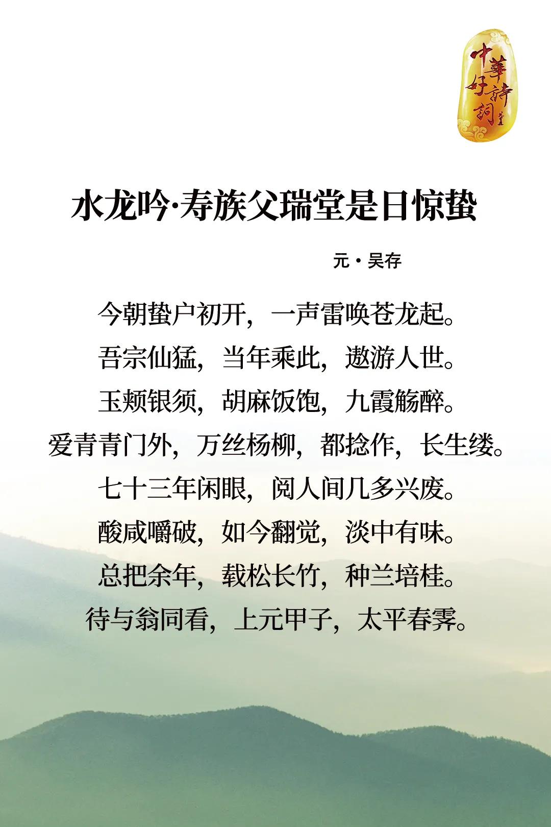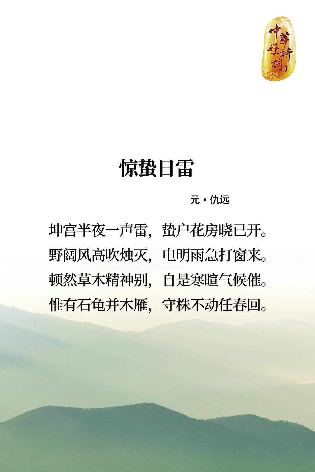 【诗词Ⅰ春气萌动惊蛰始】 惊蛰,又名“启蛰”,是二十四节气中的第三个节气,它是古代农耕文化对于自然节令的反映,有着相当重要的意义。 时至惊蛰,气温回暖,雨水增多,万物生机盎然,今天就让我们来一起欣赏几首惊蛰时节的诗词吧~