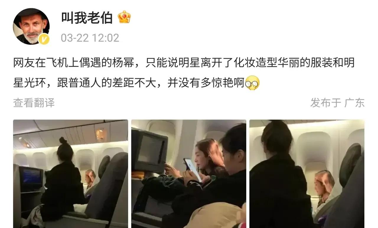 网友在飞机上偶遇杨幂,离开造型和化妆,她本人颜值和普通人差不多。 杨幂是86年的,也是奔四的人,第一眼看没有惊艳的感觉,反而有一种邻家姐姐的亲切感。 大家也不用要求太高,都是人怎么可能逆生长,那些所谓的冻龄女神都是科技手段留住的,未来还会反噬,自然老去挺好的。
