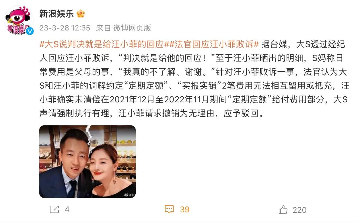 大S回应汪小菲晒清单的行为,不愧是美容大王,依然牙尖嘴利,让人招架不住。 大S说,判决就是最好的回应,她相信法律,毕竟爸爸养儿女天经地义。 S妈也说,他们的家庭开支是他们的事,只能说汪小菲长点心吧,当时签得有多爽,现在就有多难堪。 每天一睁开眼就是各种天价开支,还要帮兰姐还9.8亿,不敢想。
