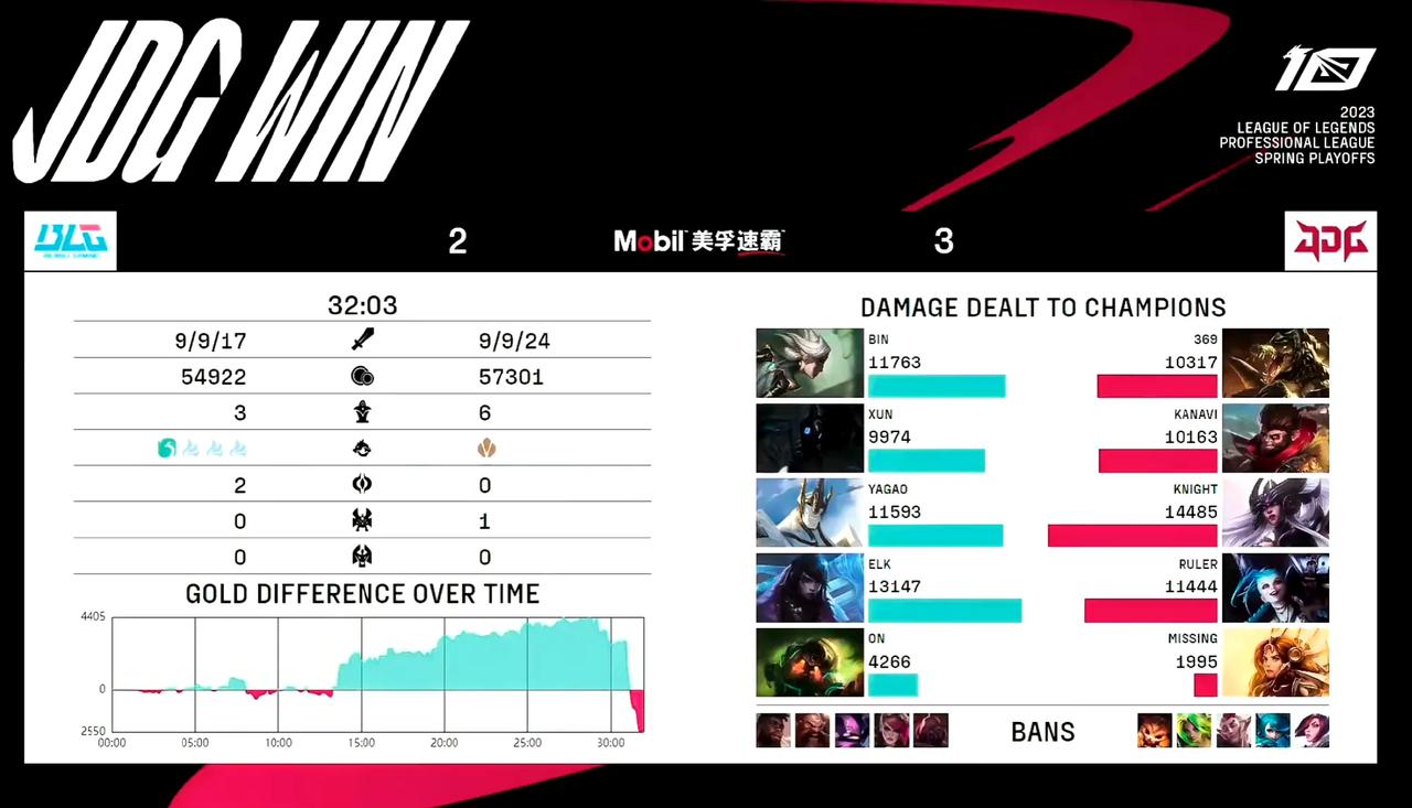 一场非常精彩的季后赛,最后以一种意想不到的结果结束了比赛!恭喜京东战胜了BLG进入胜者组决赛。 BLG最后关键时刻可能还是出现了“肌肉记忆”。短短几分钟之内几乎重新了这个赛季出现的毛病,把一场马上到手的胜利拱手送人!只是不知道这场比赛的结果会不会影响到BLG败者组比赛的备战???而明天出场的EDG和OMG能不能从这场比赛中得到启发???