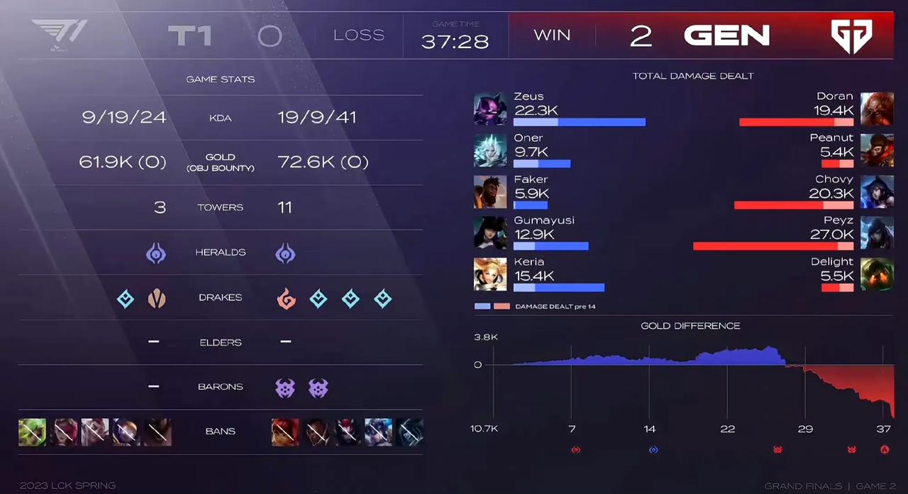 风光无限一个赛季的T1难道要在总决赛上遭遇最大的一场失败吗? T1联赛中从未失手的女警体系在最为关键的总决赛第二场吃到了败仗!而zues今天的表现如同梦游般,在看看doran的发挥确实没想到在上路T1能被GEN打出差距来。 如果T1每年都是在关键时刻来这么一下子,那估计今天T1要想在世界赛上更加突破又是一件难事……
