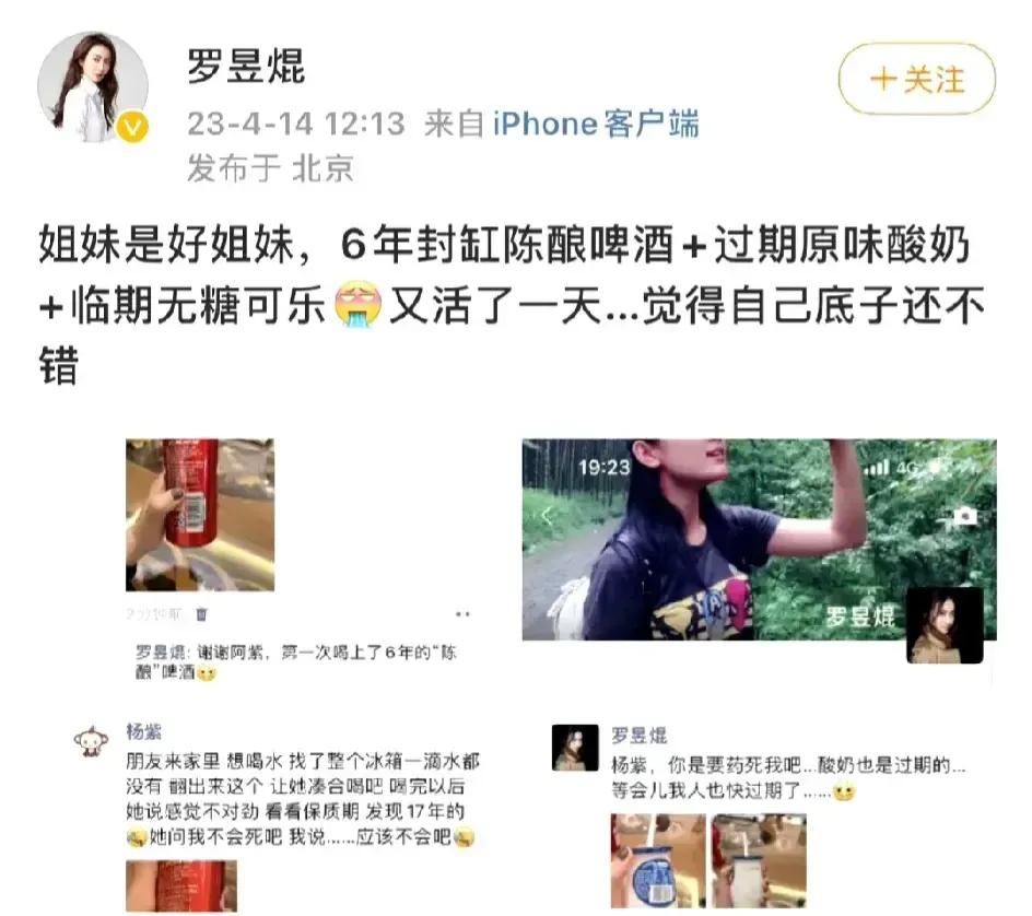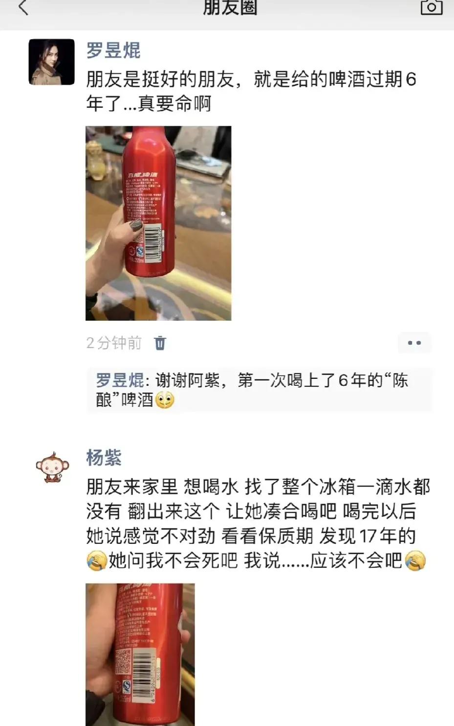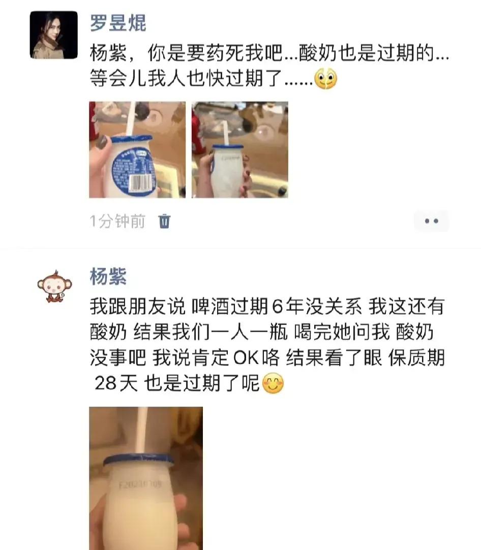 杨紫朋友圈曝光,太好玩了!我也想要这样的朋友,太有趣了! 杨紫朋友去她家玩儿,结果杨紫竟然拿过期六年的啤酒和过期酸奶招待朋友。 朋友哭笑不得,发朋友圈,朋友让她去看医生被拒绝。 不得不说,杨紫真的太大意,也很好玩,有趣的灵魂万里挑一,我紫牛掰!