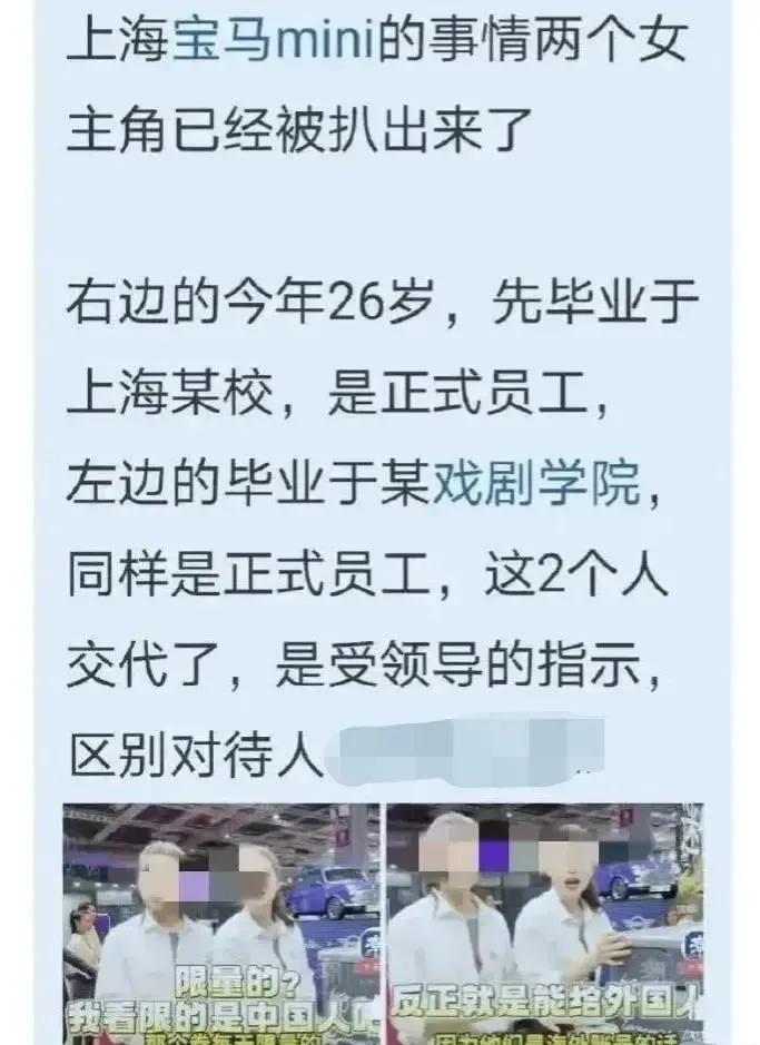 宝马mini事件两位女生身份曝光,右边的女生26岁,毕业于上海某学校。 左边的毕业于戏剧学院,她们身份被扒以后,崩溃发言是公司安排的,她们只是打工人而已。 我觉得再怎么安排,也安排不出她们谄媚的笑,对自己人和歪果仁的态度两种面孔,这才是引起公愤的根本吧?