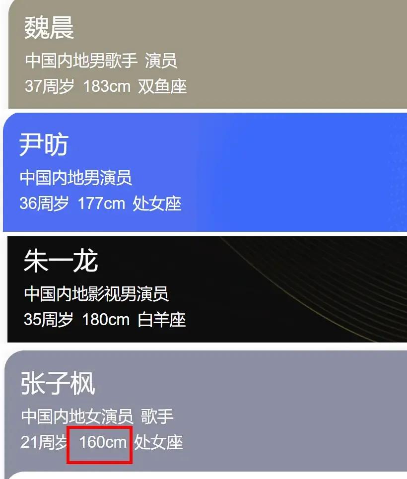 张子枫可能不到160吧?她和177的男演员站在一起都矮大半个头。 张子枫是北影毕业的,按理说招生应该有身高要求吧?不明白不到160的张子枫周冬雨是怎么考进去的。 不过身高不过关,但她们都是演技派,一颦一笑都是戏,可以允许多元素,总比整容脸强吧?