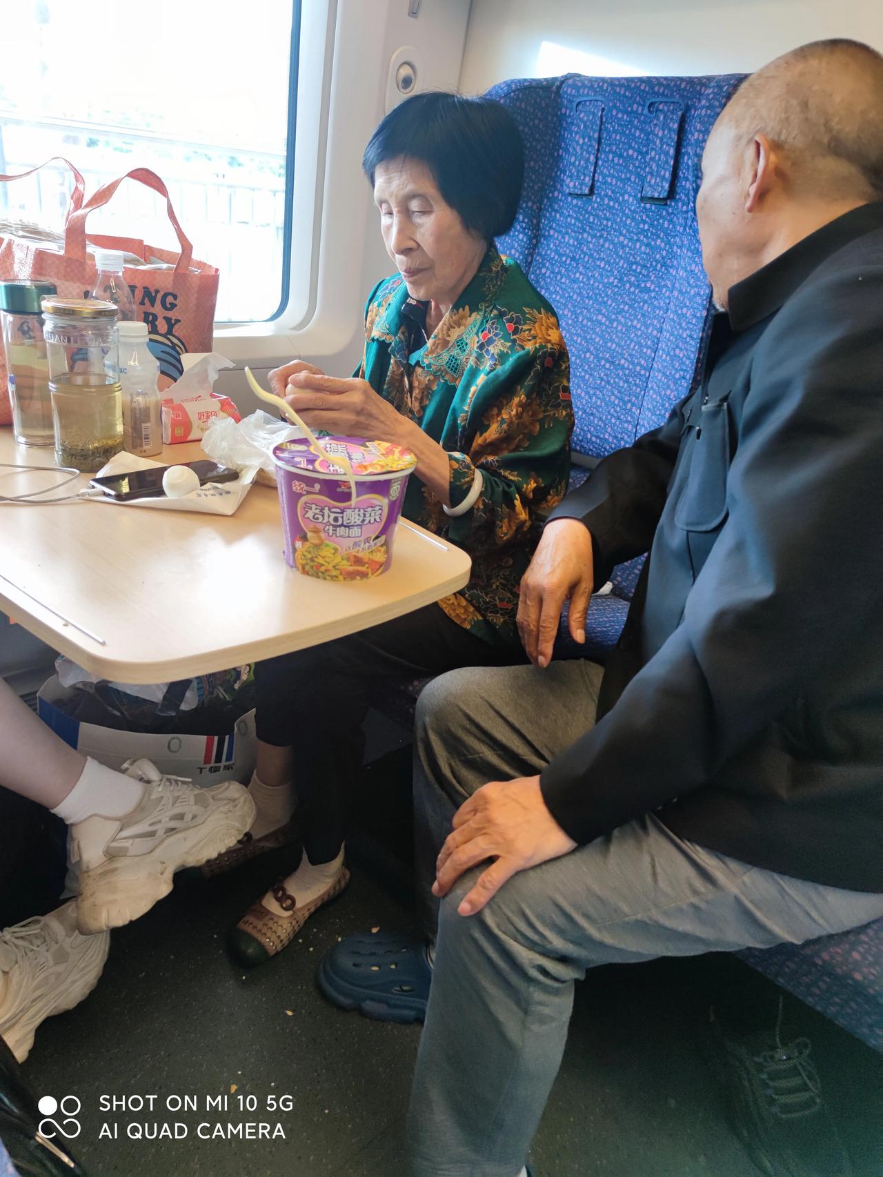 看着对面的老俩口一起剥着鸡蛋,泡着方便面,吃着零食,我觉得这也是一种幸福。 和老婆坐火车出远门,我们一般也是提着一大袋子吃的(包括方便面),虽然高铁上有饭吃,但是又贵又不好吃,自己带的,都是自己喜欢吃的,还便宜。希望以后老了,我老婆还可以和我一起出远门,带着一袋子零食,一起坐着火车,泡着方便面,再剥两个煮好的鸡蛋,再加两根火腿肠。 简单而平凡的生活才是最幸福的……