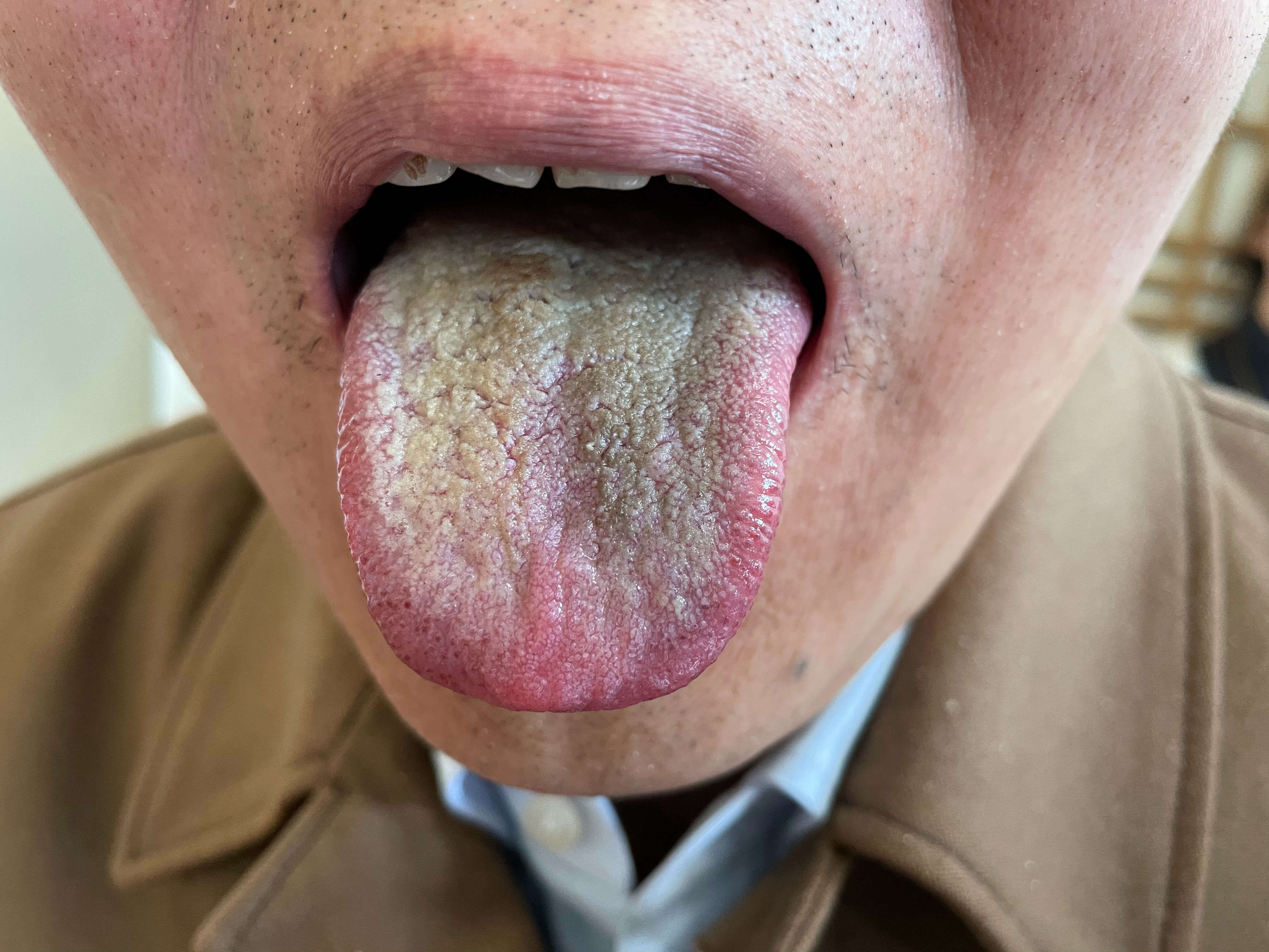 下图舌苔的病人年逾花甲,经常感觉胃里不舒服,还有三高和眼底问题。除了中药调治,还嘱其戒酒、戒烟,他说很难做到,那么健康存在很大的风险。