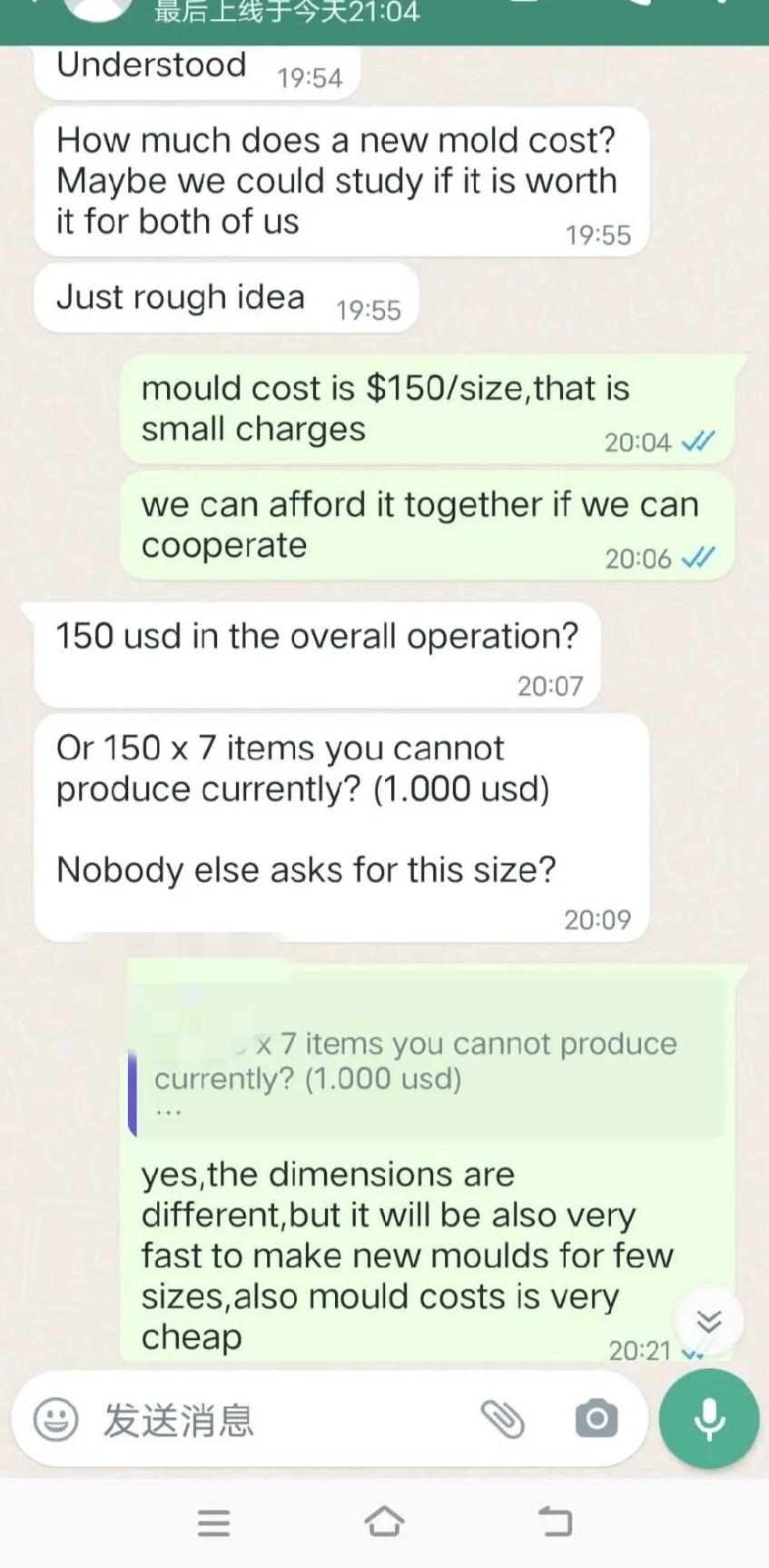正当我以为报价石沉大海的时候,西班牙客户突然WhatsApp联系我了,没有消息的原因原来是因为这个…… 广交会第二天的西班牙客户,问了我们很多详细的问题,唯独没有让我报价。正当我以为没戏的时候,晚上发来了邮件让我报价。因为当时很忙,然后回去了一直见客户,一直到4月25号左右才给他报了价。然而报出去后,犹如石沉大海,他完全没有一点回音,我已经不抱希望了,然而今天在去北京的高铁上,他居然发WhatsApp给我了。说居然说没有收到我的报价,真是活见鬼了,我赶紧直接把报价WhatsApp发过去。他看了一会问我有几个产品怎么不报价,我说没有一样的模具,然后就问我模具费的事情……不管怎么样,总算有点希望。至少过了这么久了,他还在等着我的报价,把我当做他的候选人。 随着深入的交谈,现在无非就是一个模具费的问题,他让我明天发邮件给他看怎么解决这几个需要开模具的问题。这个不都是小菜一碟吗?1000美元的模具费相比他20多万美元订单,我全部买单都没事。毕竟我哪怕只有5-8%的利润,也远远大于这个模具费了,所以那都不事,何况这还只是一个开头。明天我就要艰难地答应他,为了支持他,为了第一次合作,我愿意独自承担这个模具费了。 所以做外贸开发新客户不用着急,只要有缘分的客户,跑都跑不掉的。而且开发新客户的过程是最有意思,也是很有激情的,尤其是大客户……