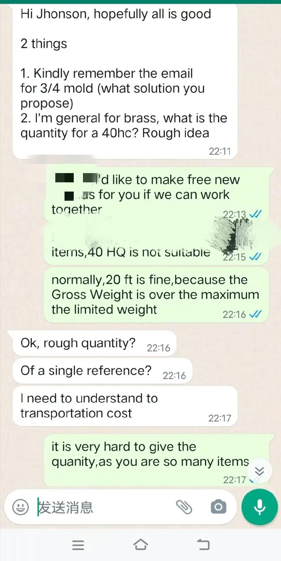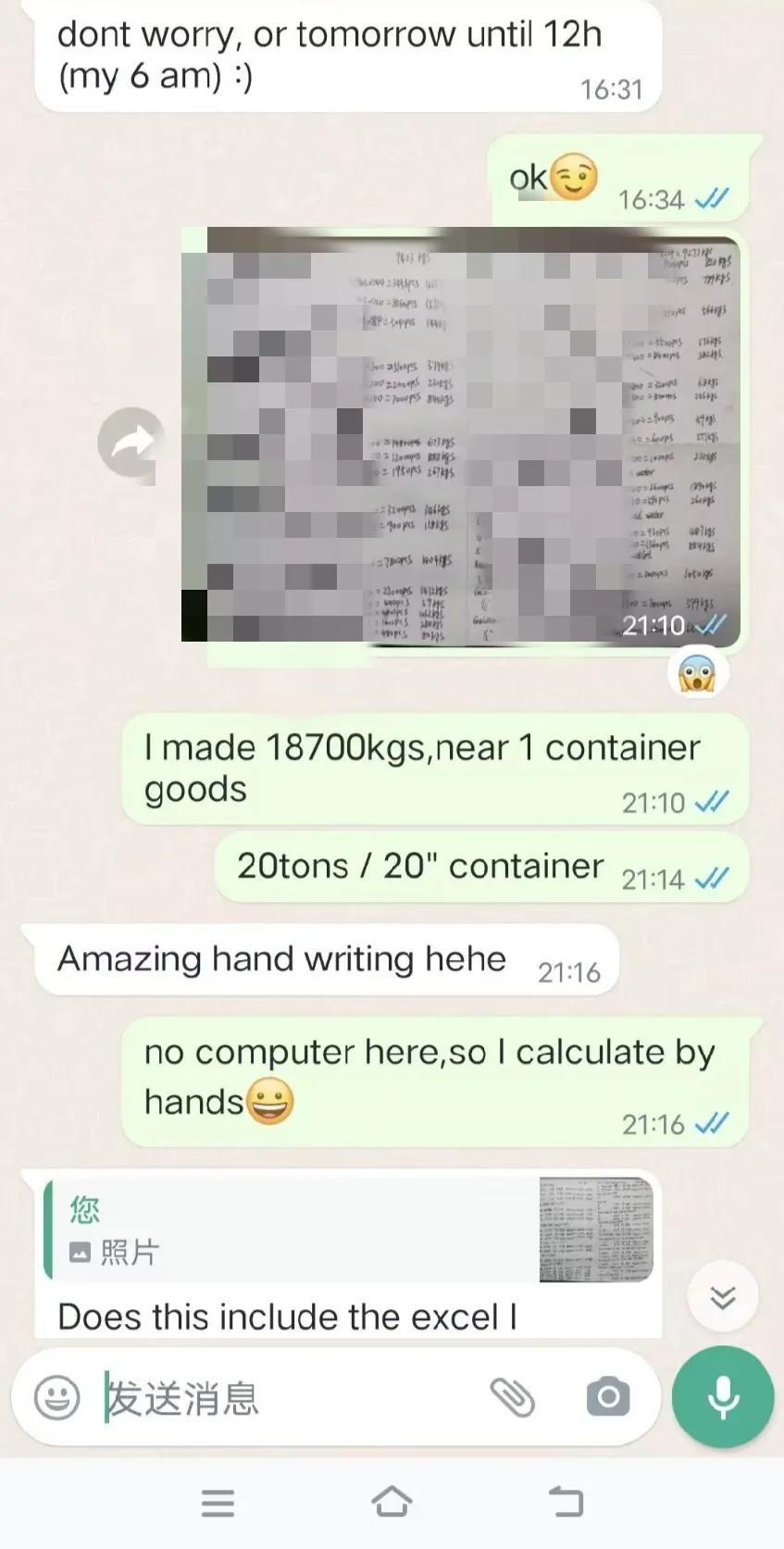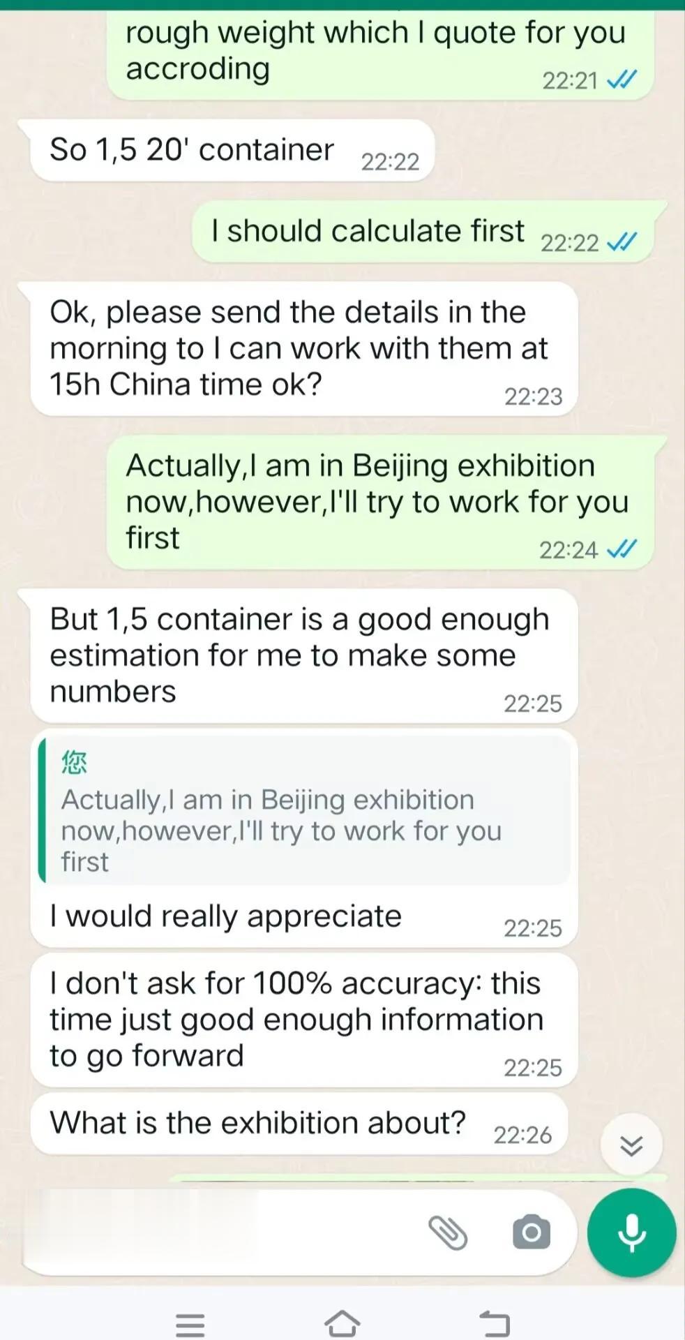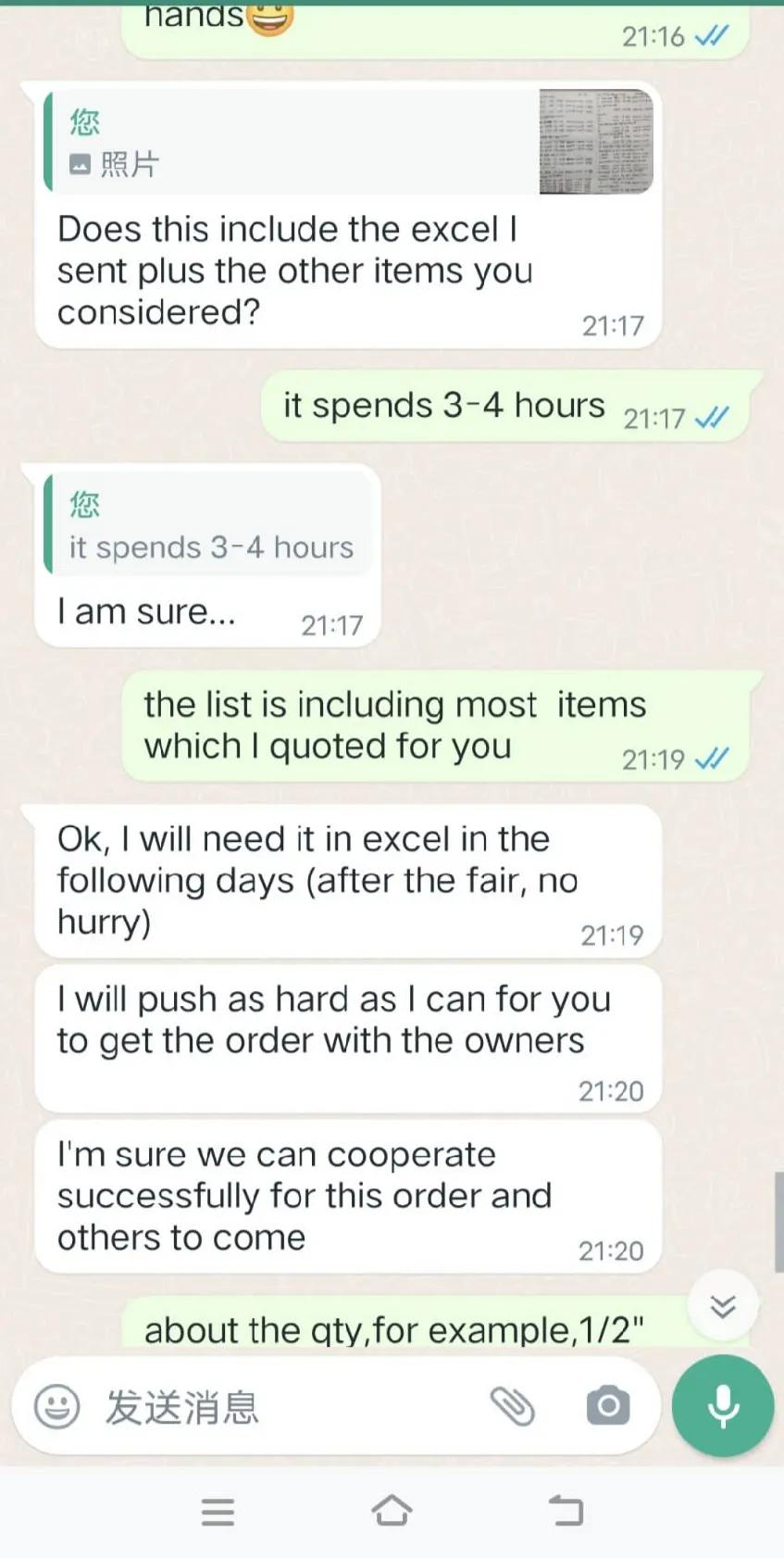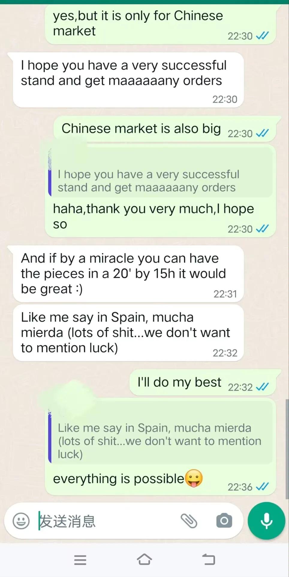 用实力征服西班牙新客户,大家觉得我有几成的几率能拿下来这个客户?据我判断应该是一个不大不小的客户。 昨天当客户认为我是不可能在今天整理出来一个20尺柜子的数量的时候,我用李宁的广告语回复了他:everything is possible!于是昨天晚上我洗完澡已经11点多了,但是还是准备好纸和笔开始帮客户在核算数据,直到凌晨1点。因为今天还要参展,所以不能通宵达旦,便去睡觉了,想着今天晚上再给他完成。 今天参展的时候我有家供应商正好也在我摊位不远,他晚上请我去吃了晚餐,回来后就马上开始继续昨天晚上的工作。又经过2个小时左右的战斗,终于把他要下单的大部分数据整理出来了。 客户首先是对我这张密密麻麻手写的数据给惊呆了,他说这张订单应该是问题不大,价格是没有问题的,表示会尽快帮我拿下订单。当然,这个只能说8字有一撇了,我还不能确定,因为还要寄样确认,还要等他的老板决定(客户是这家公司的采购经理,应该是家大公司)。 不管怎么样,客户对我的肯定,我还是很开心的。当然,肯定又有一些老前辈觉得我这是在班门弄斧,在显摆,所以老前辈们请嘴下留情,你们就当看看笑话。我写的这些,还是有一些朋友们喜欢看的,包括对新手也是多多少少有那么一点点帮助的。 明天还要继续参展,今天可以早点休息了,最后上两张图给大家一点福利,北京展会上美女走T台宣传产品[呲牙][呲牙][呲牙]