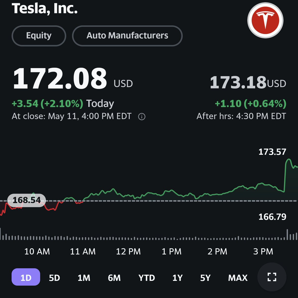#特斯拉 TSLA[股票]# 尾盘也上涨,可能是由于看到”Boss “要回归了吧