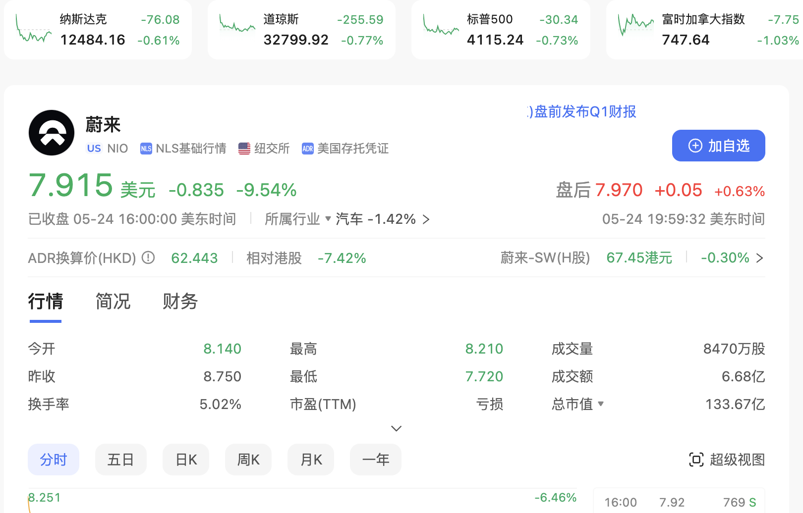【道指跌超250点 新能源车股普跌蔚来汽车跌超9%、小鹏跌超5%】