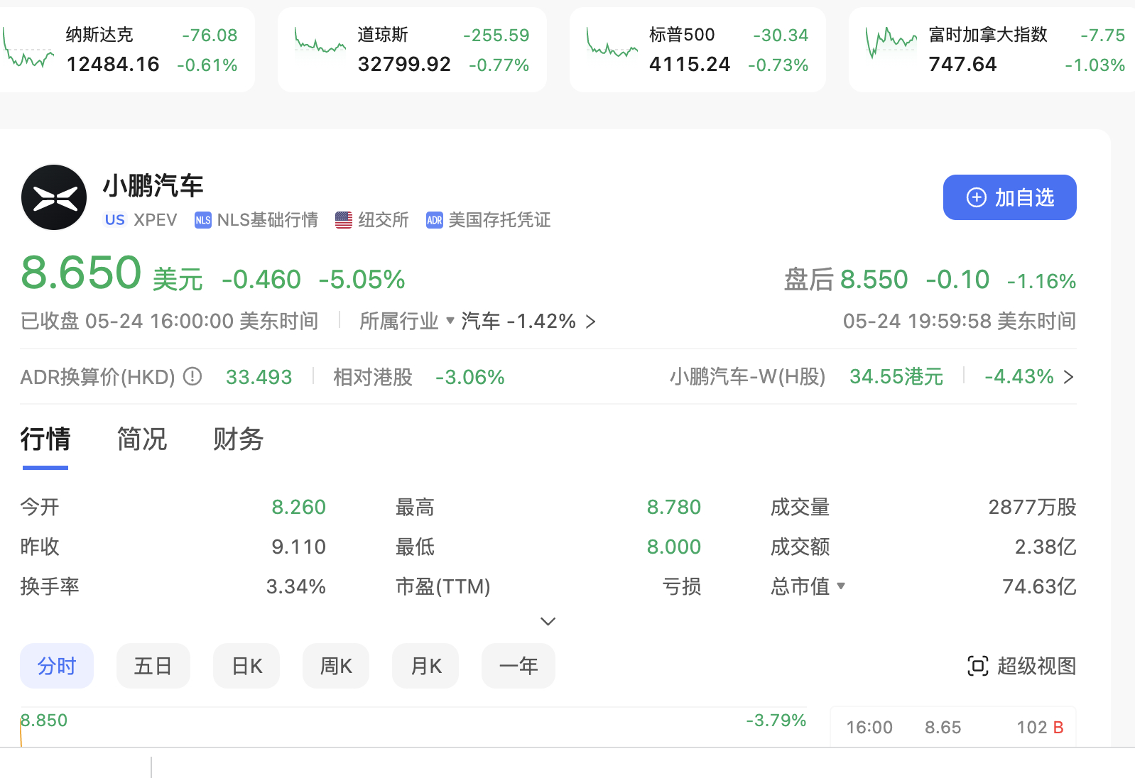 ——小鹏汽车跌超5%,一季报亏损23.4亿