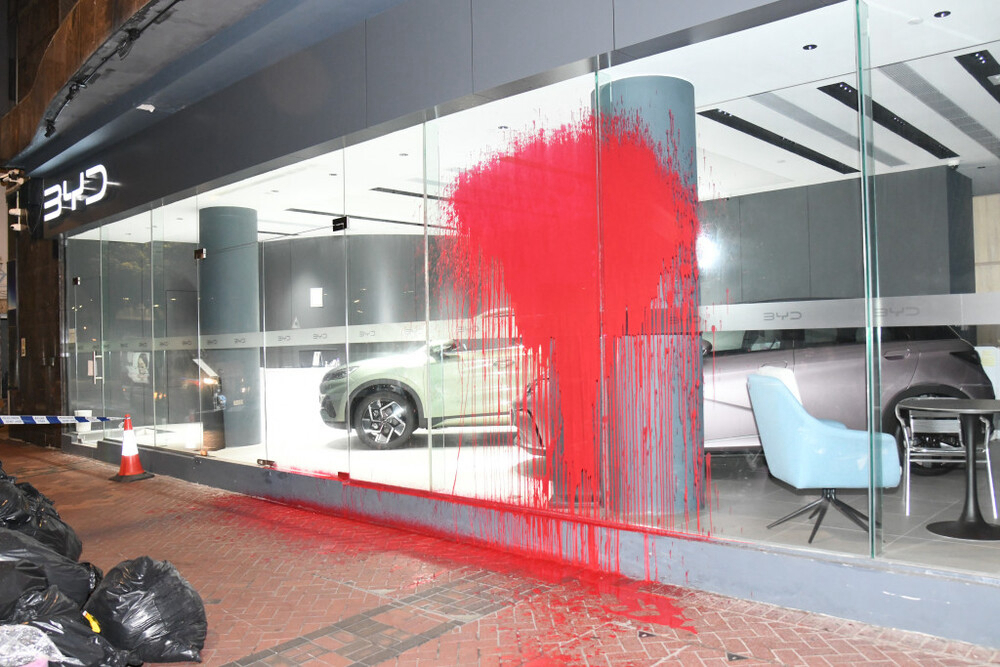 香港媒体报道,第一起案件发生在12日凌晨三点多,比亚迪城市展台被泼洒油漆