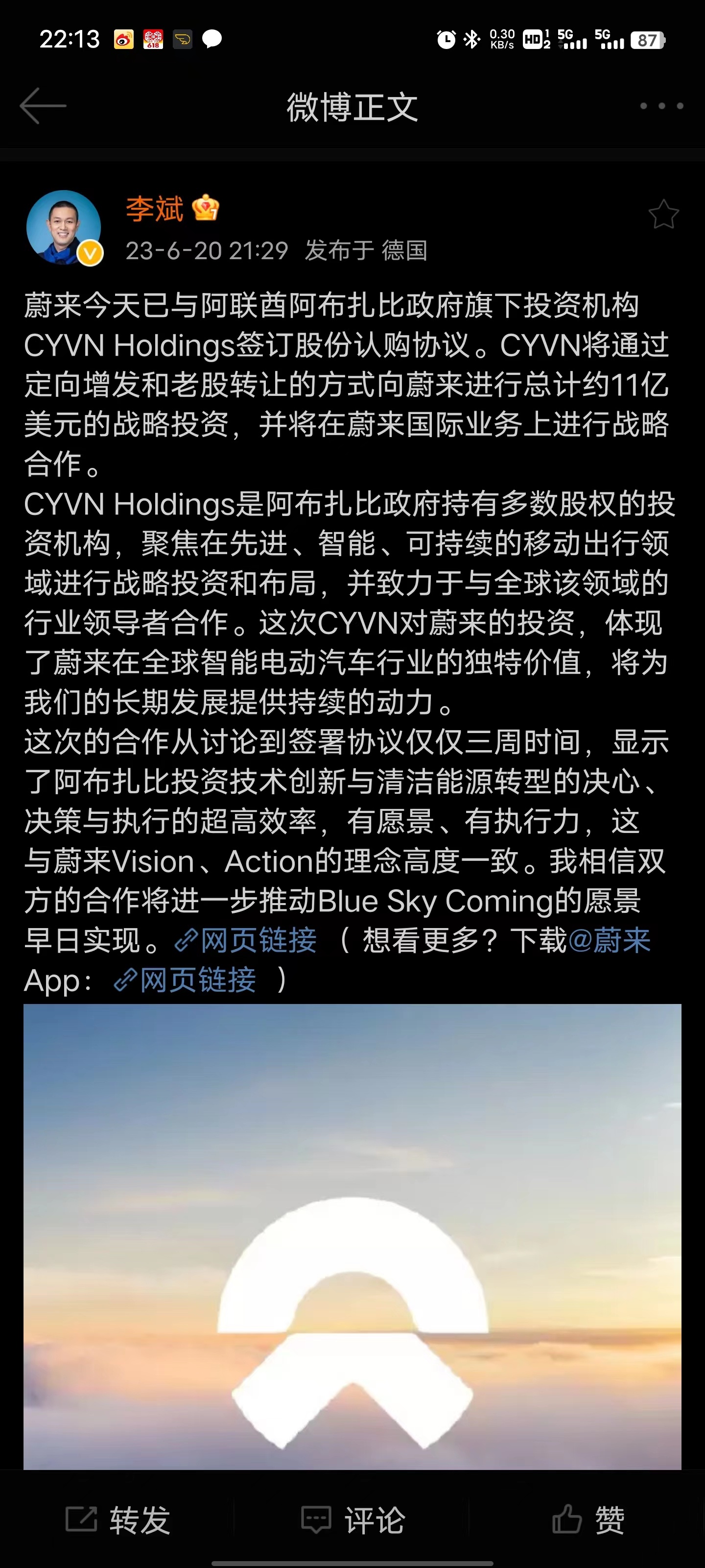 #蔚来获阿布扎比投资机构战略投资# (11亿美元)