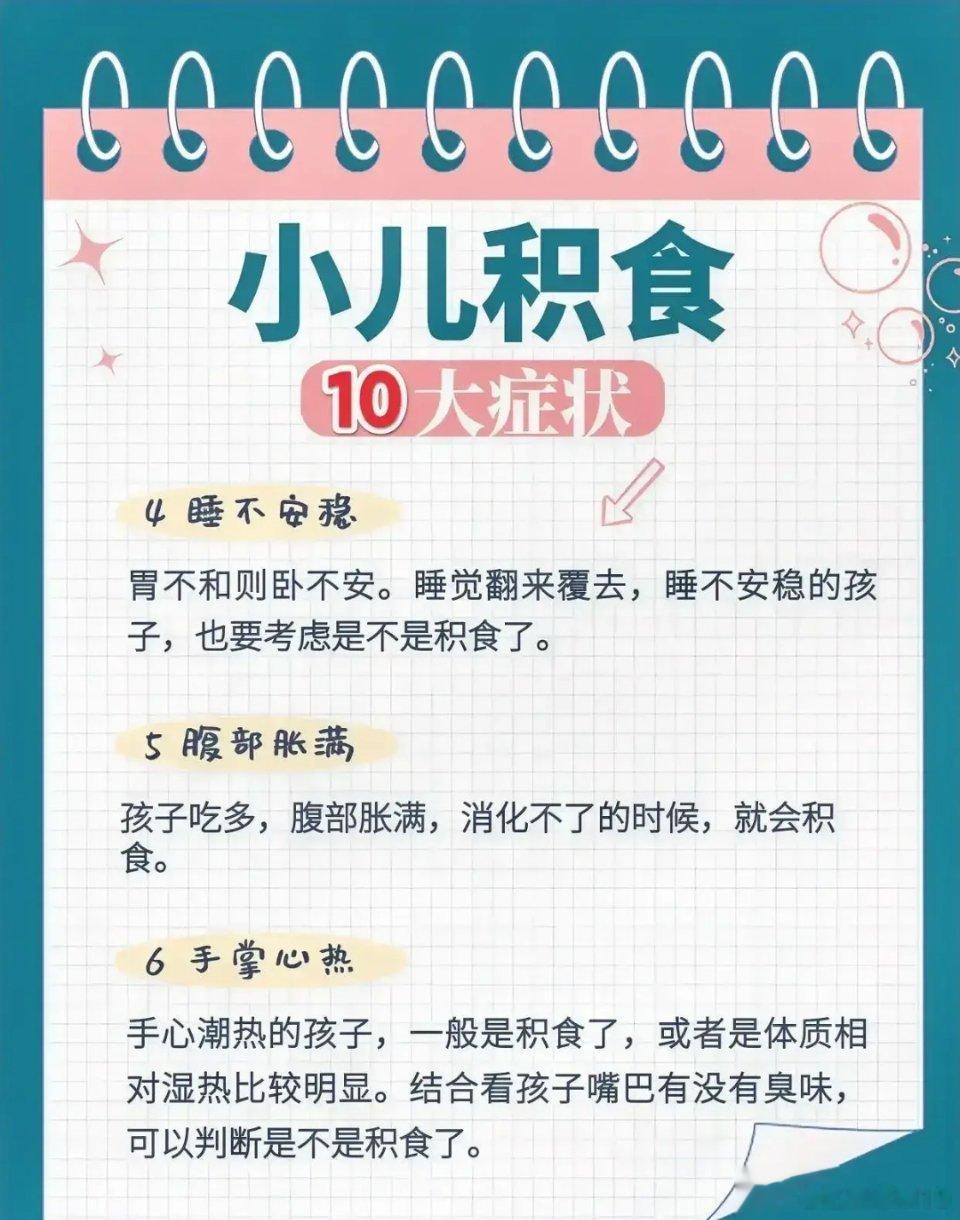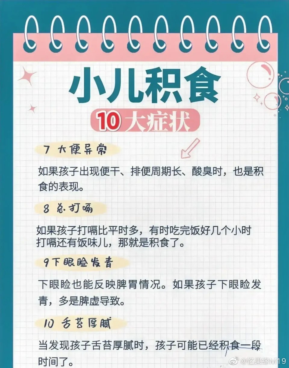 此外,要想小儿安,三分饥与寒。平时孩子的饮食,一般以七分饱为宜,切忌暴饮暴食,以免损伤脾胃,加重食积。#忆果缘1971##智能中医药##中医养生#