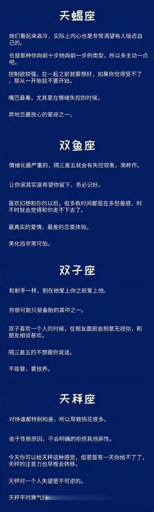 如果你觉得和射手,双子,处女谈恋爱太虐心不妨换成天蝎,水瓶,摩羯来试一试……不一