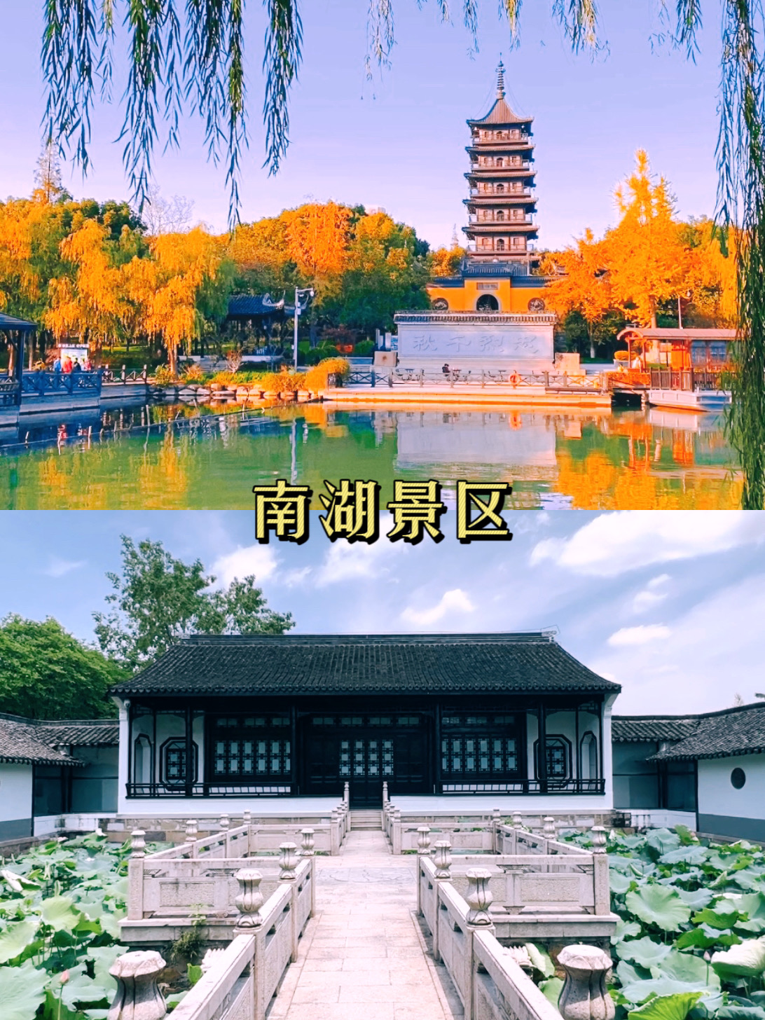 来到对面,就是著名景点江南园林揽秀园,沿着桥边走,有一座文星桥,在南湖边欣赏日落。