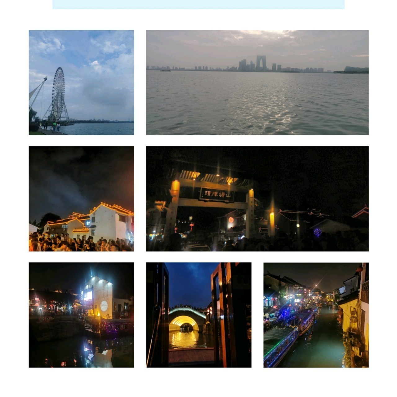 晚上坐游船,船上有录音机放介绍,还有评弹,船上很凉快!七里山塘夜景很漂亮值得去