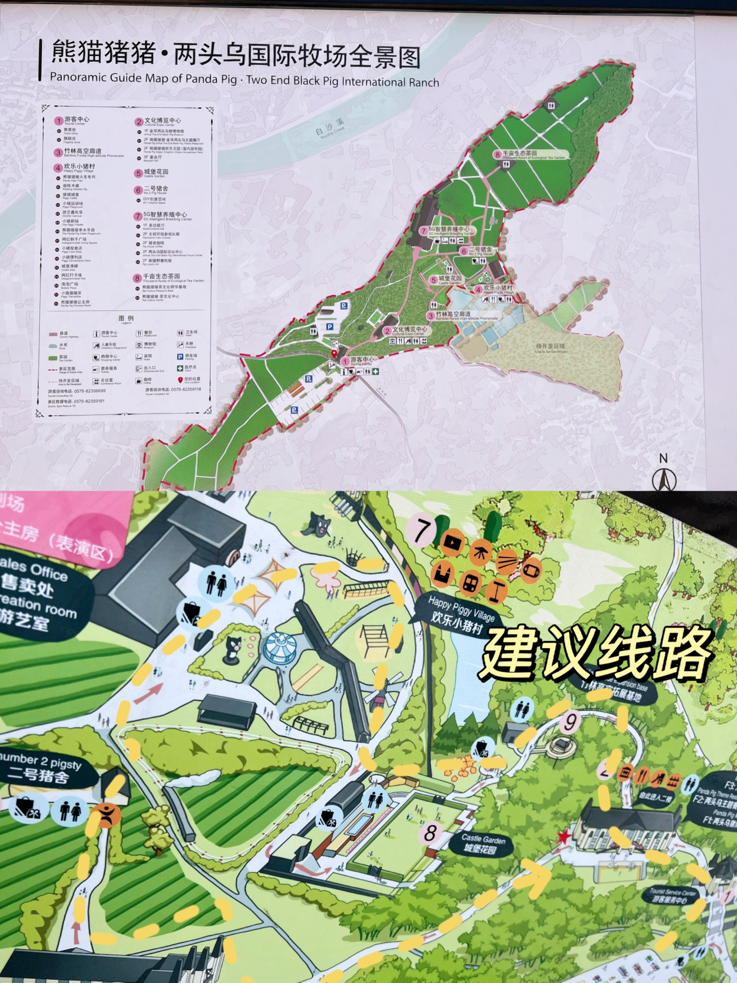 整个区域主要分为猪猪博物馆(2楼餐厅、室内游乐园)、空中竹林步道、城堡花园、5G养殖馆 小猪村游乐园(小火车、表演管)、茶园几个区域
