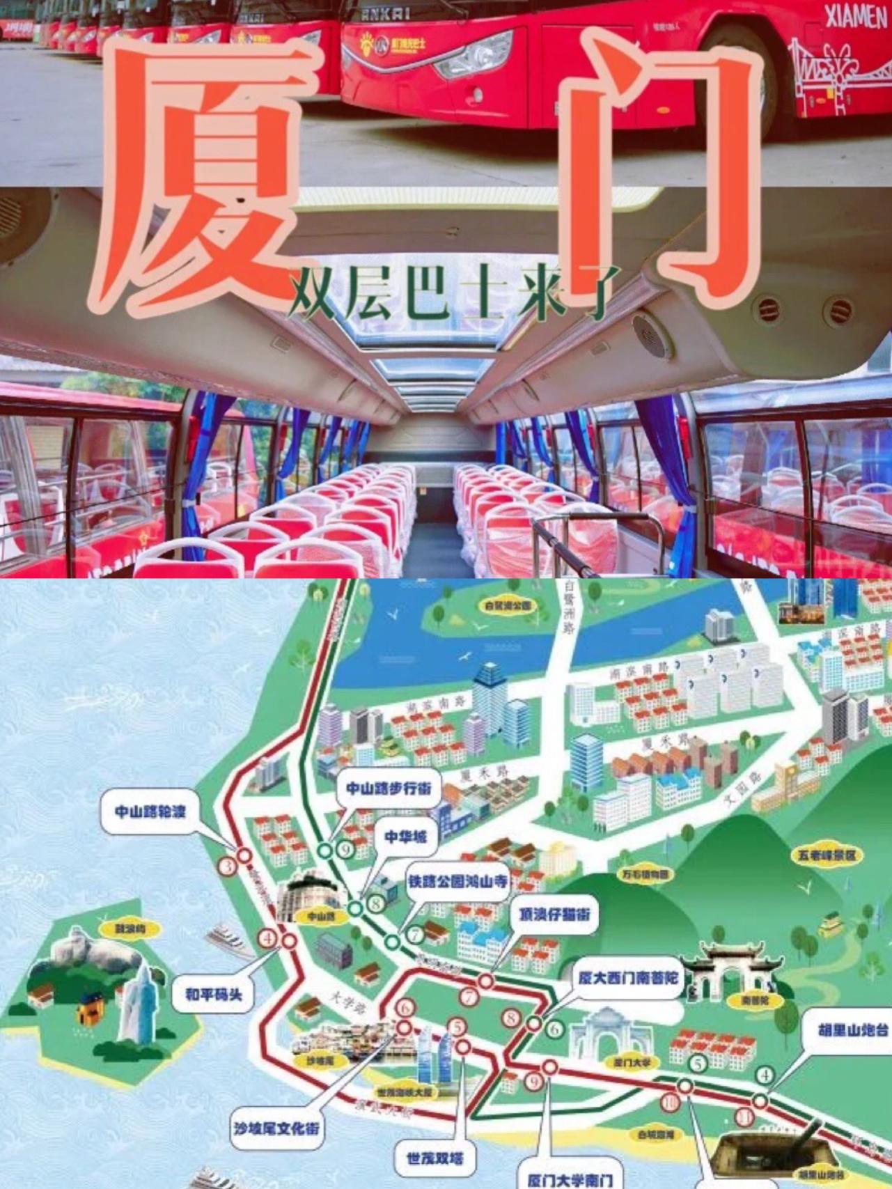 从厦门邮轮中心开始出发,通票24小时内可以无限上下车。双层巴士又可以尽情享受沿途美景,途经22个景点。