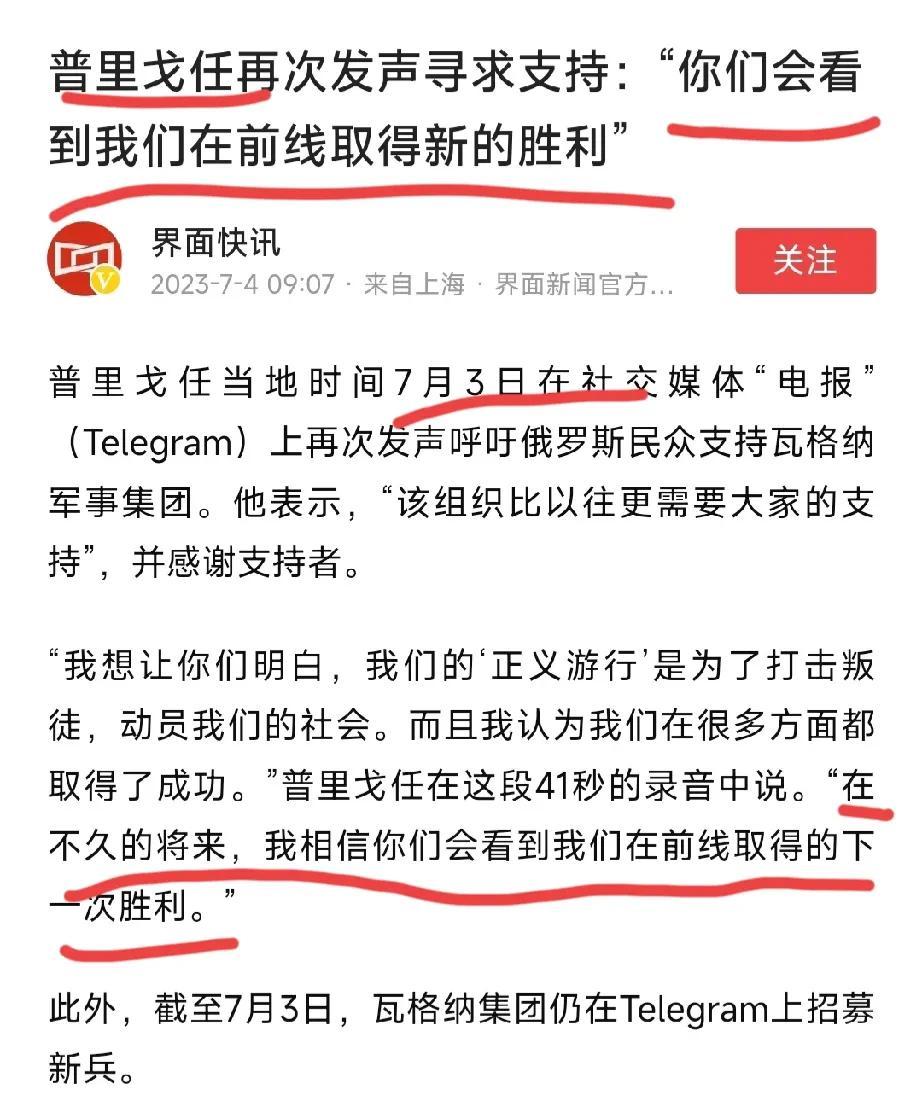 普立戈任:瓦格纳集体一个独立利剑,预示着新的胜利…… 昨天,瓦格纳集体负责人普立戈在一份声明中发表了令人深思的一句话:“在不久的将来,我相信你们会看到我们在前线取得的下一次胜利。” 这句话的背后意味深长,预示着瓦格纳集体在准备一次不同往常的重大行动!最新声明,也让以前的猜想不再是猜想! 据了解,瓦格纳一直在加强自身实力,不断招募新兵。更重要的是,他们明确表示,雇佣军将与瓦格纳签署合同,不再与俄罗斯国防部签订协议了。这意味着,瓦格纳集体将成为一个独立的势力,与俄罗斯和白俄罗斯的关系将一刀两断! 这样一来,瓦格纳集体就可以全面展开行动了! 瓦格纳通过谋反这一行动,再申明跟俄政府脱离关系,但是跟乌克兰,跟西方的战争还是要继续的。一盘很高明的棋,其战争模式将比国家军队要灵活的多,高明! 所以说,以前的猜测似乎正在逐步得到印证。不管怎样,现在的瓦格纳已经成为了一把锋利的利剑,悬在乌克兰西方!他们的下一步行动将会是怎样的呢?让我们拭目以待! 瓦格纳集体,他们即将掀起一场新的风暴!
